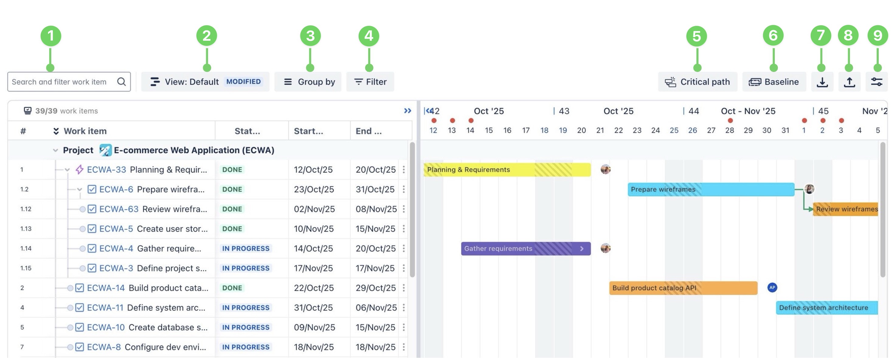 1 | Search and filter work items | Search for work items using the summary or work item key to quickly locate specific tasks. |