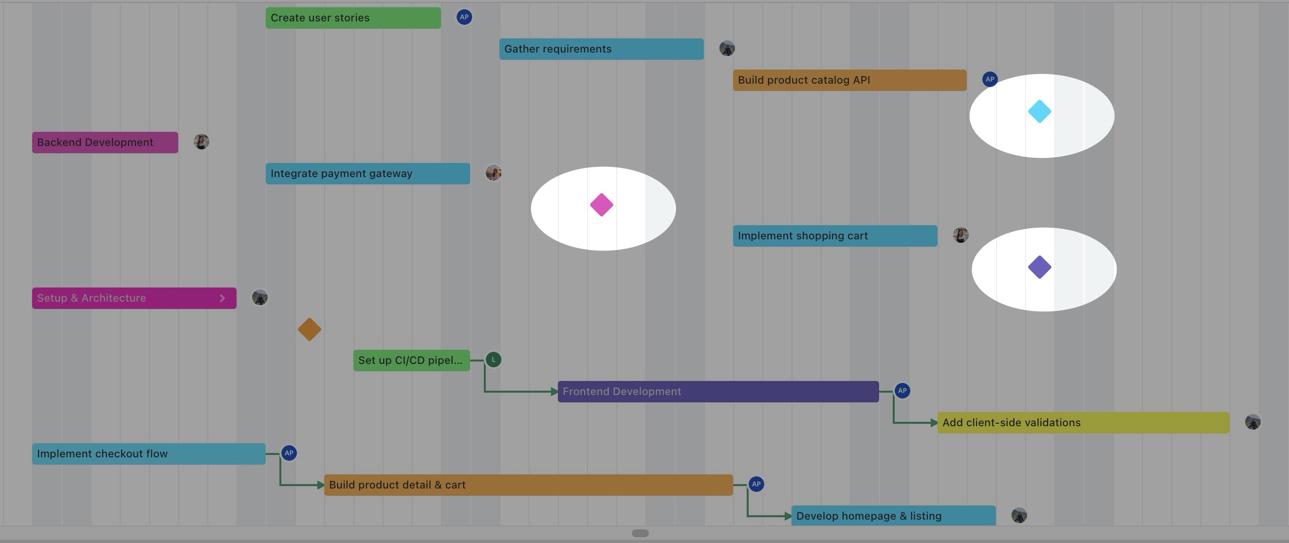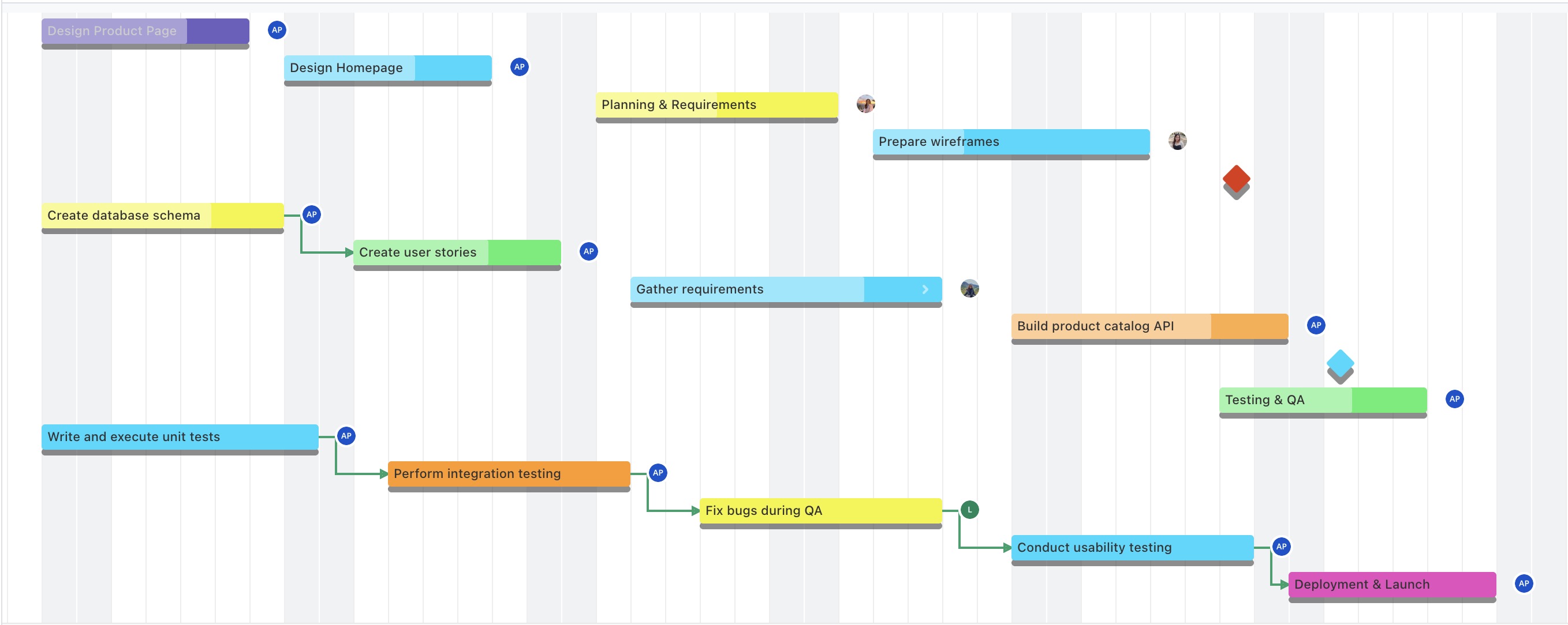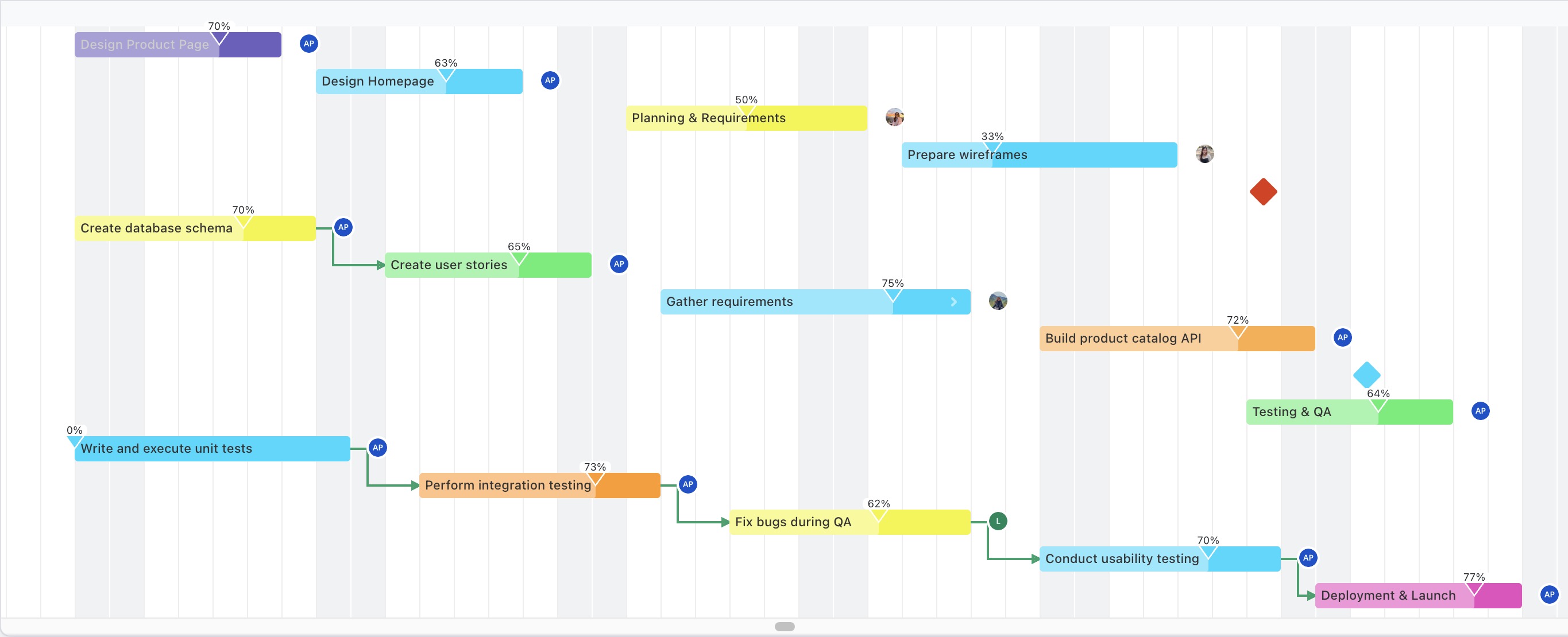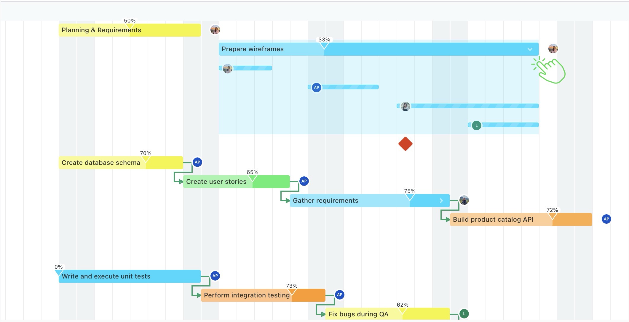 The Gantt view displays your project’s tasks on a visual timeline, with each task shown as a horizontal bar spanning its start and end dates. This allows you to easily see task durations, schedules, and dependencies.