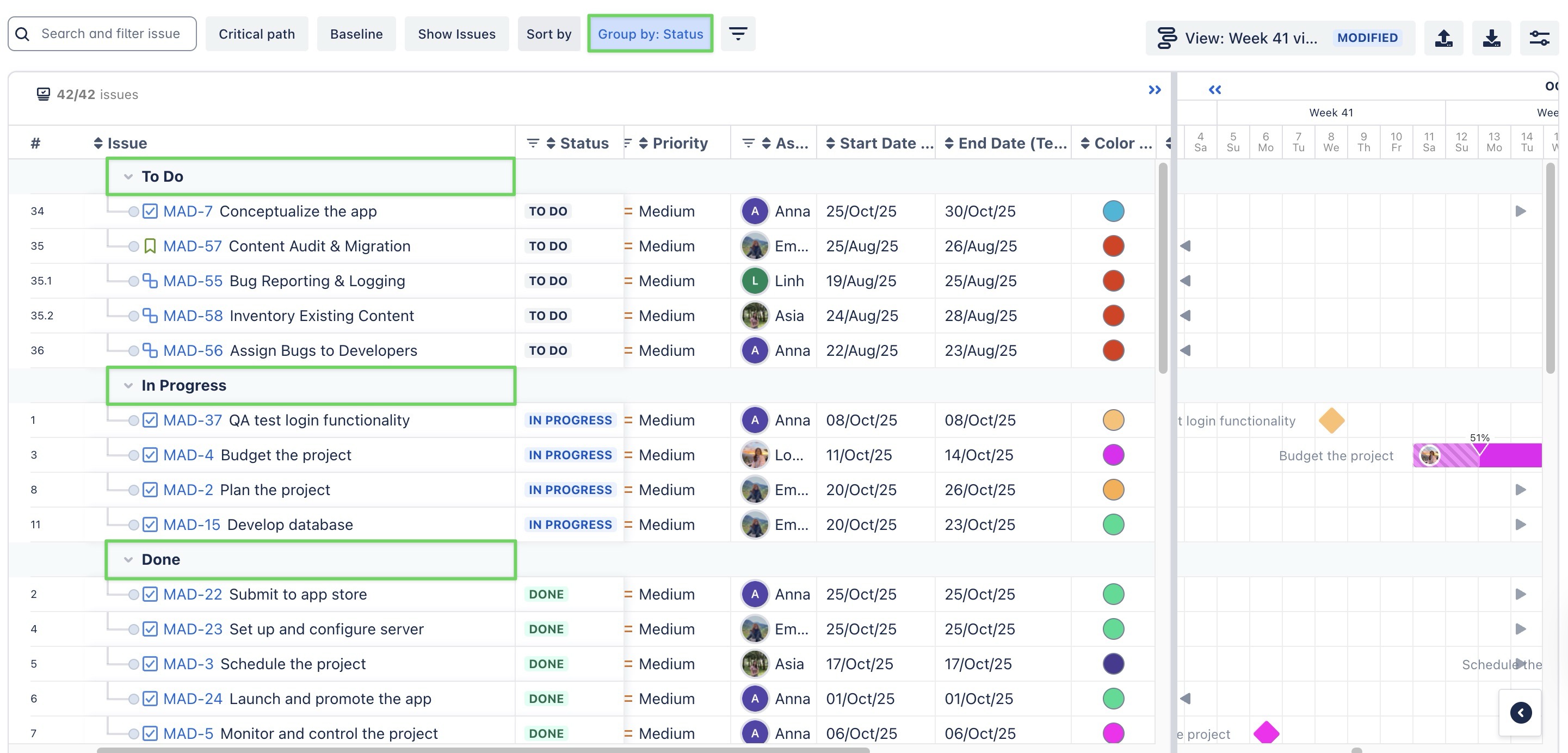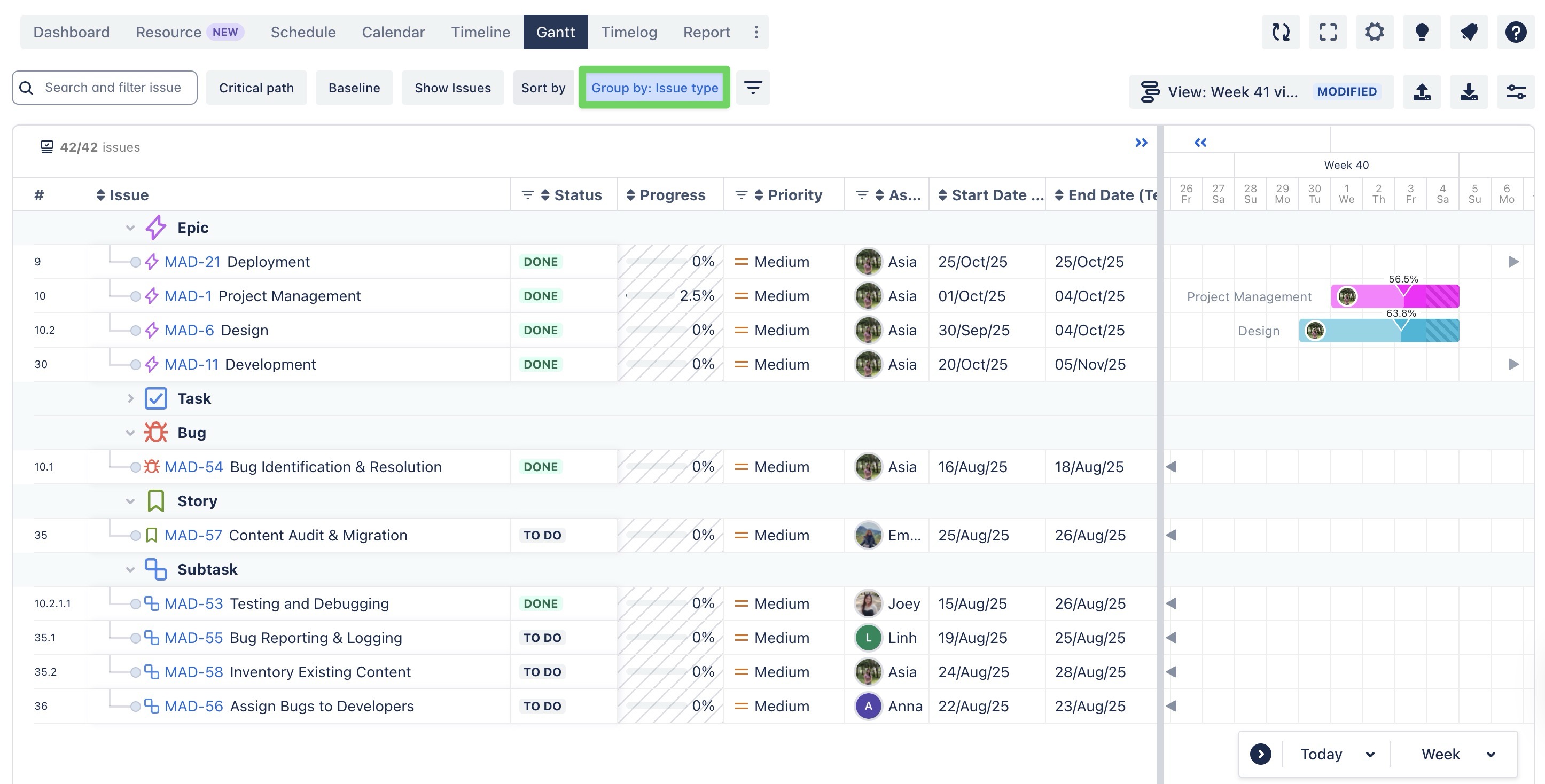 Group tasks by their issue type (e.g., Epic, Bug, Story, Task, Subtask) to understand and prioritize different types of work.