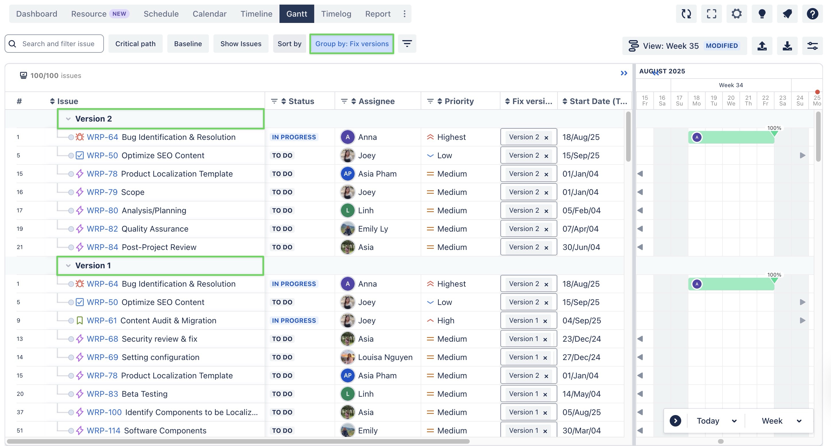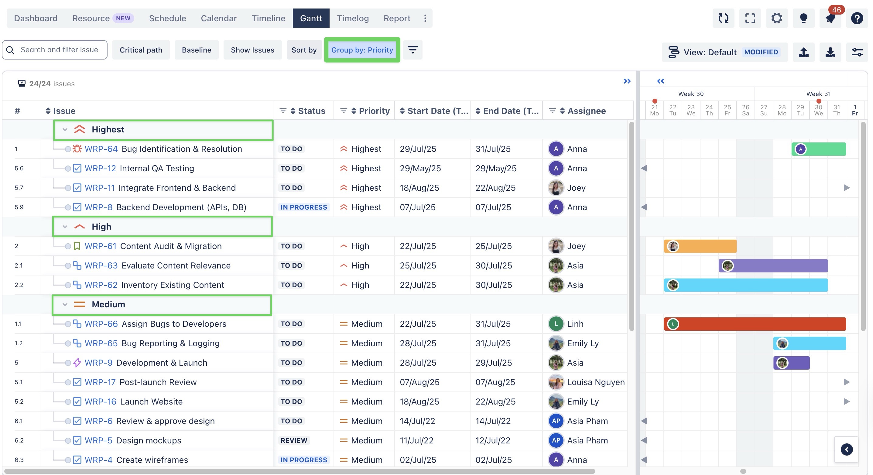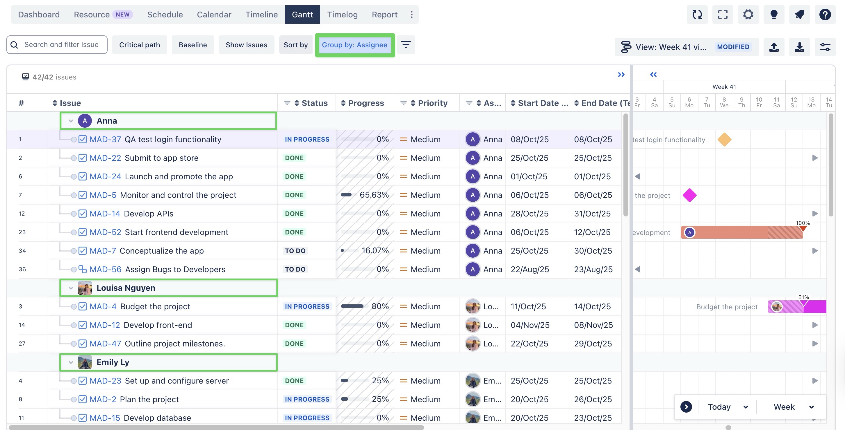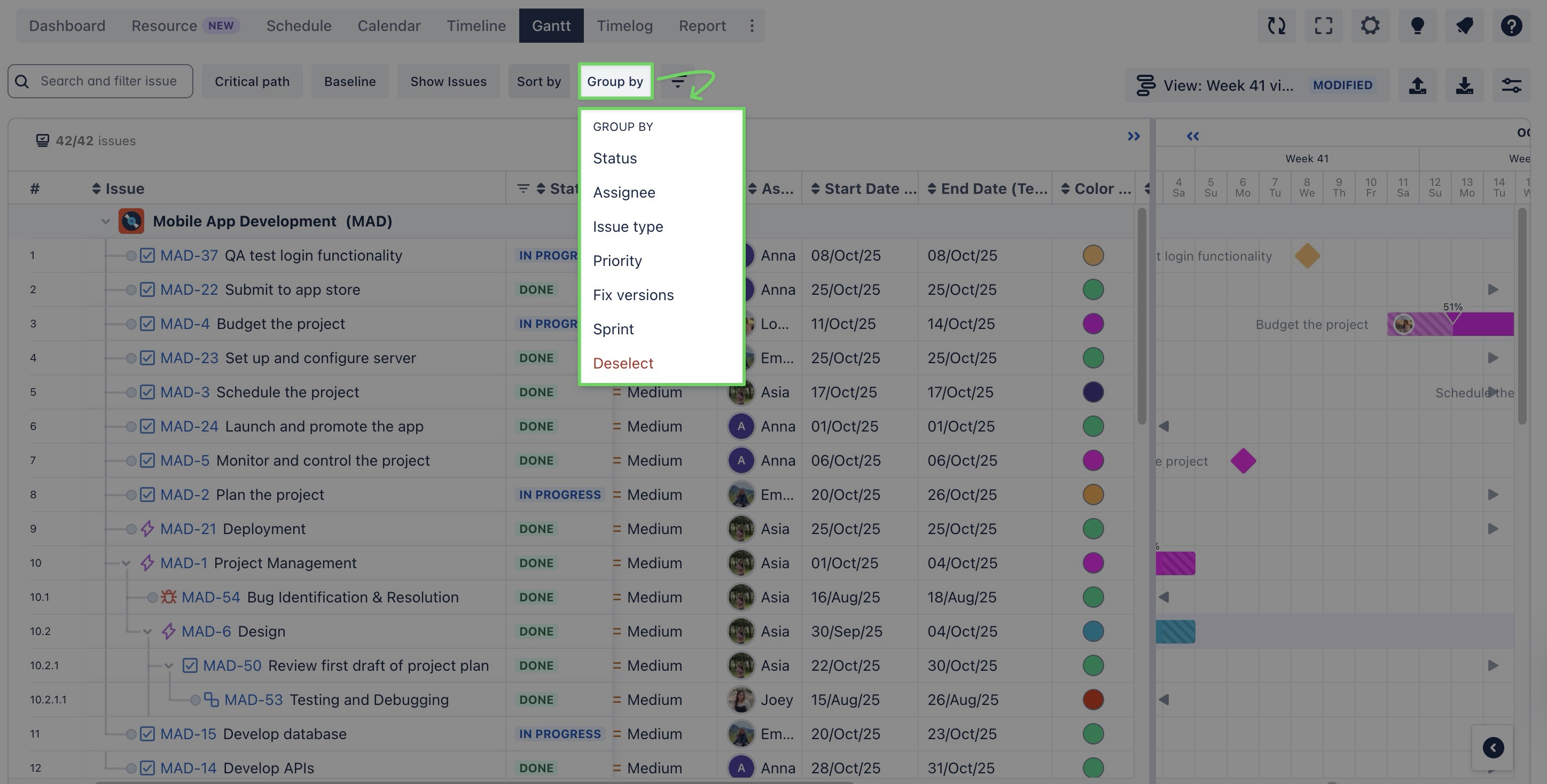 The Group by field feature in TeamBoard ProScheduler allows you to categorize tasks within your Gantt chart or Timeline based on different Jira fields.