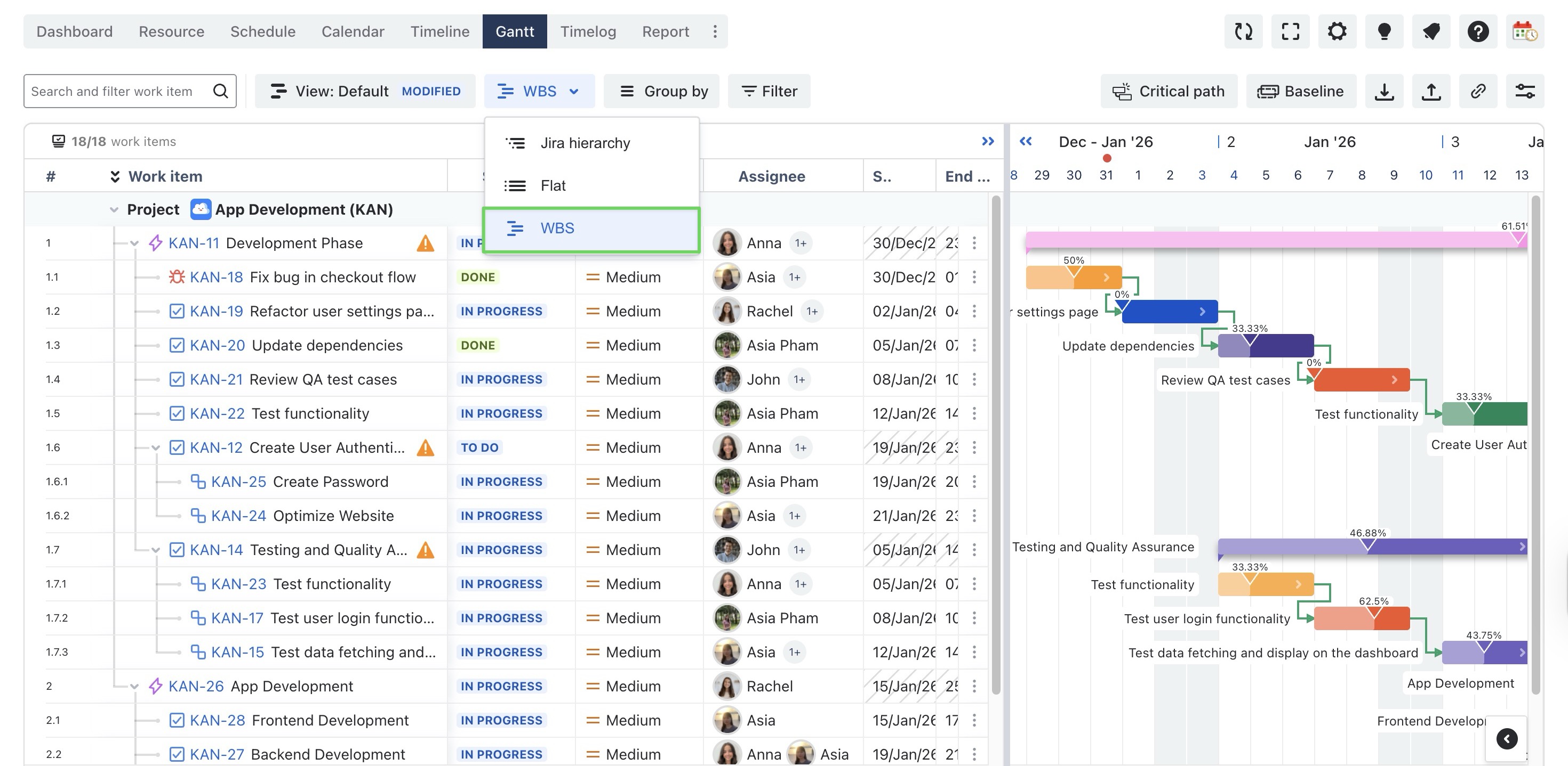 The Hierarchy View allows you to control how work items are structured and displayed in the Gantt view. By switching between different hierarchy modes, you can choose the structure that best fits your planning and tracking needs.