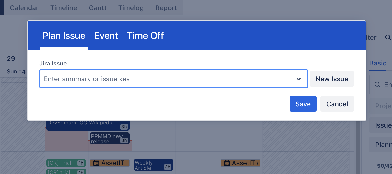 Drag-and-drop: Click the βissuesβ button to filter or search for existing Jira issues, then drag and drop them onto the board, assigning them to specific team members.