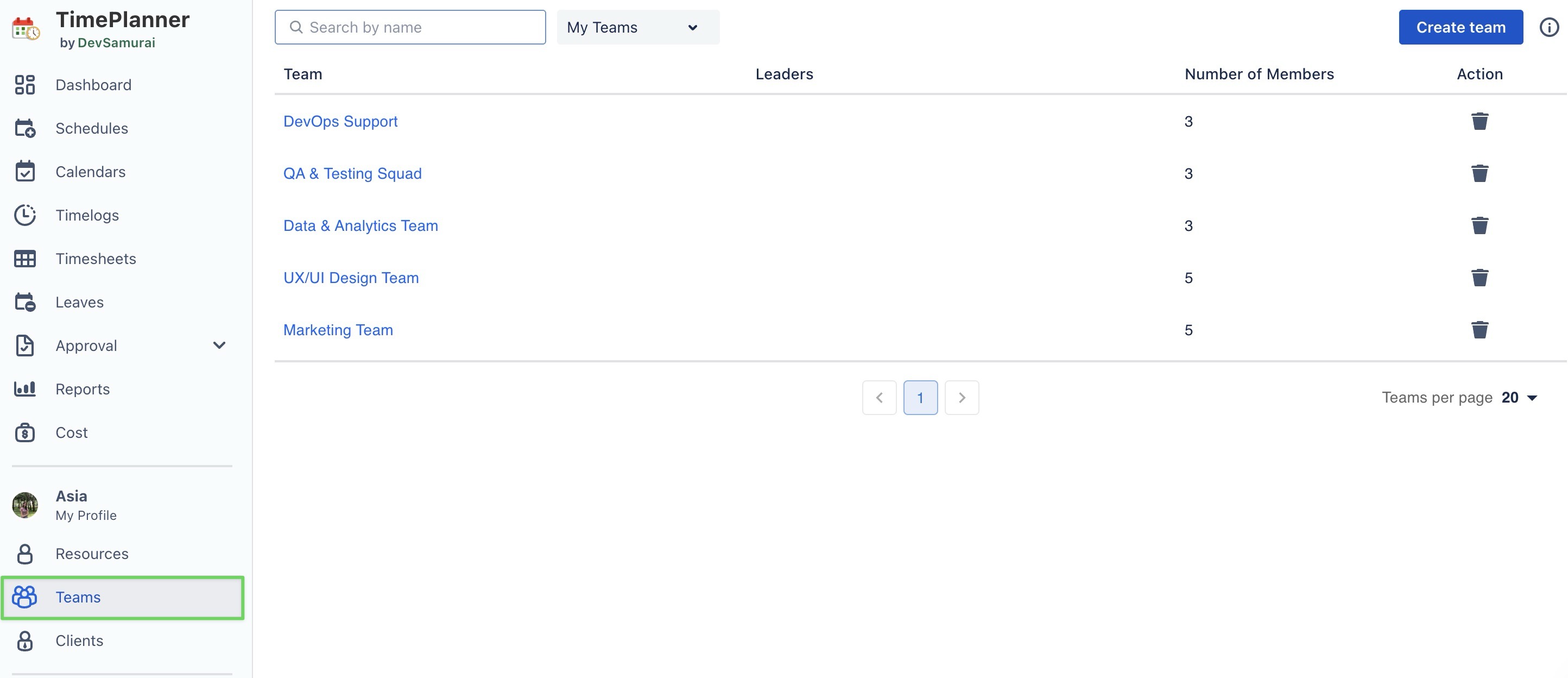 Create teams in TimePlanner
