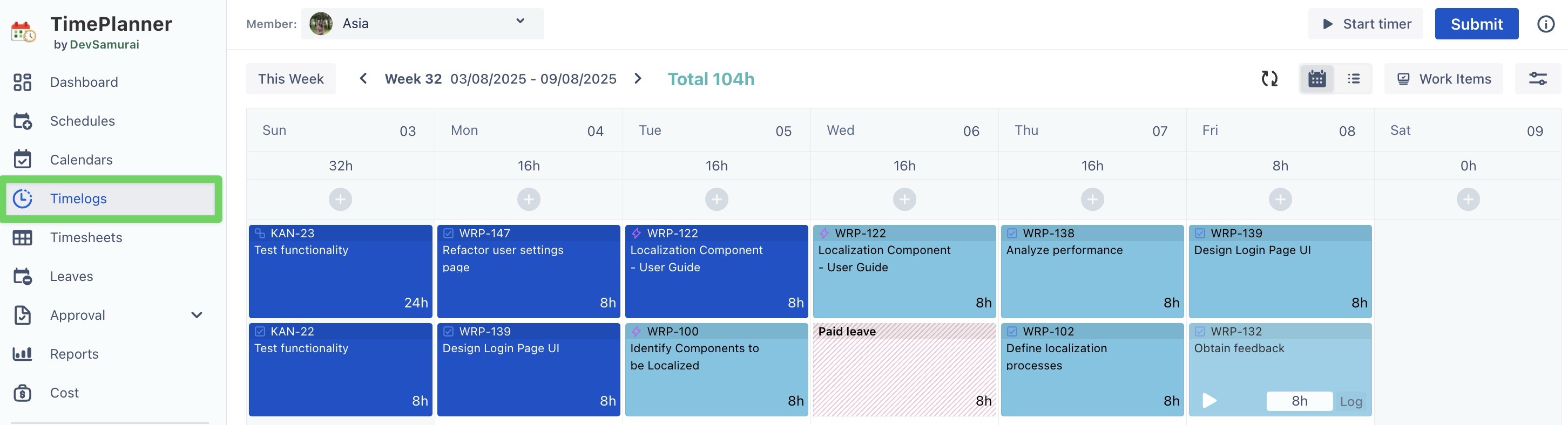 Log time in TimePlanner