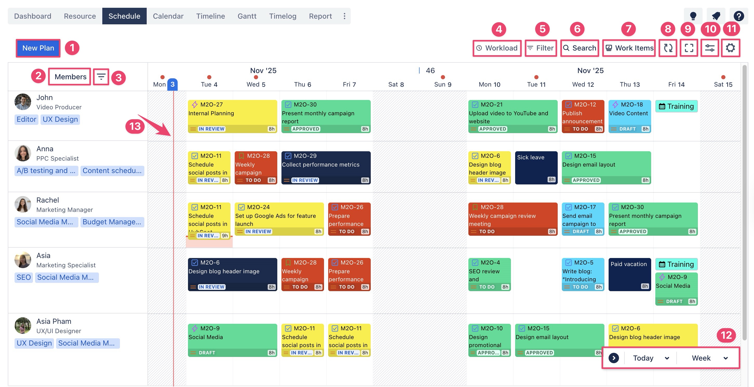 Toggle the Workload Board to view resource workloads. You can see which members are underloaded, balanced, or overloaded, enabling better capacity management and task reallocation. | |
