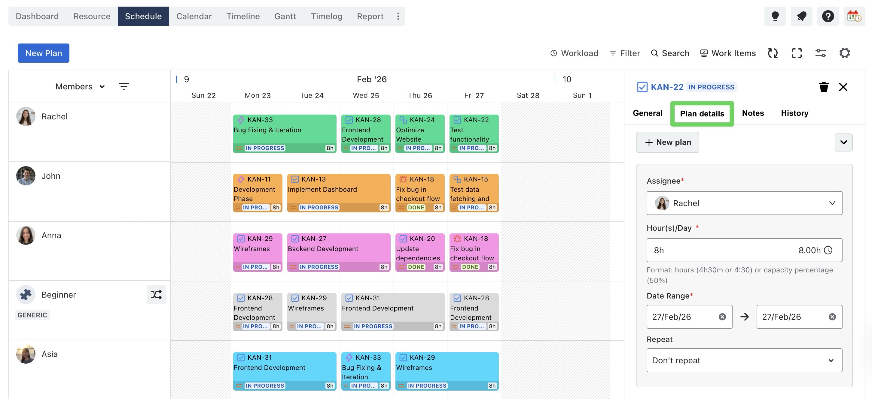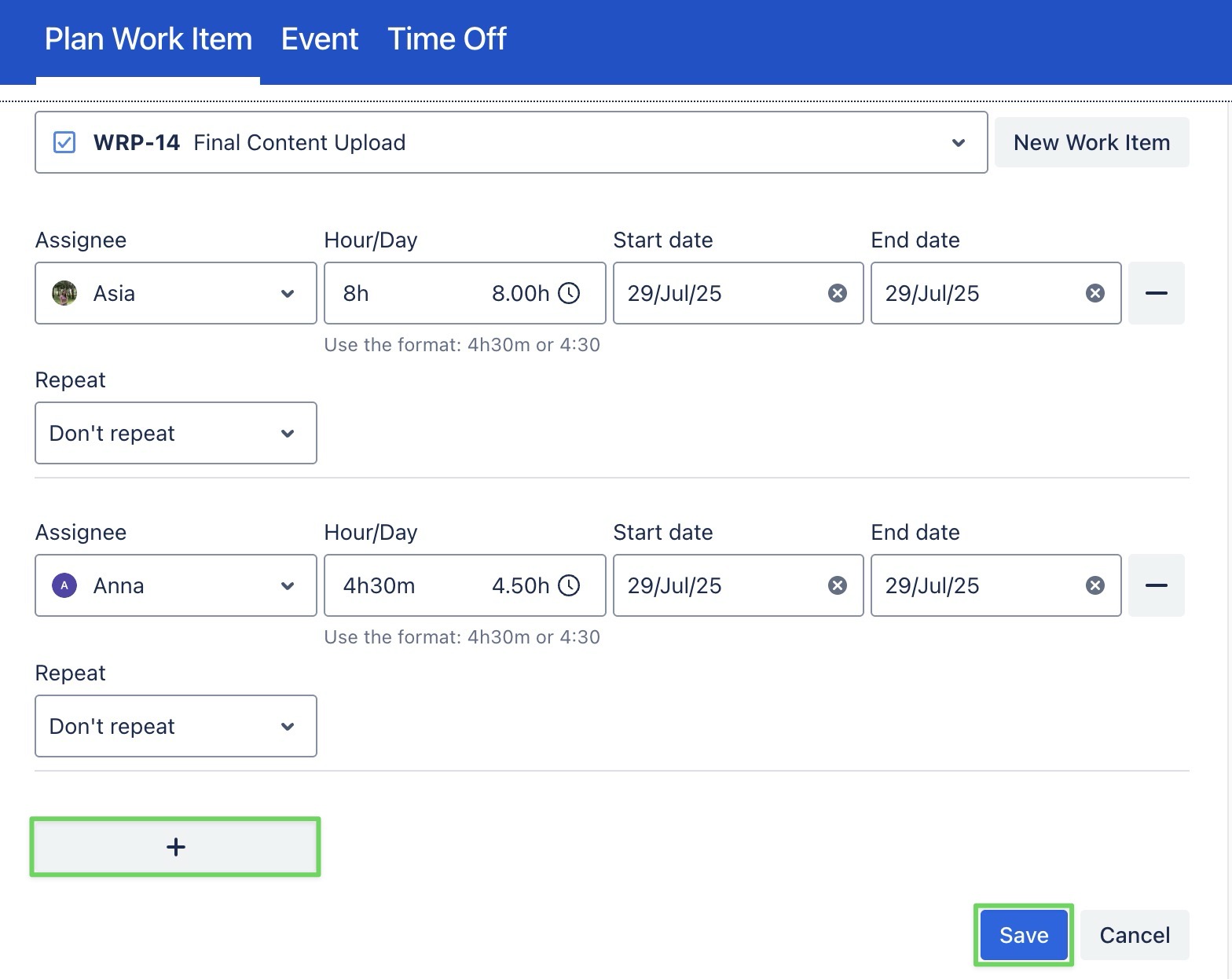 You can drag and drop the task card to change the start and end dates for each person if needed.