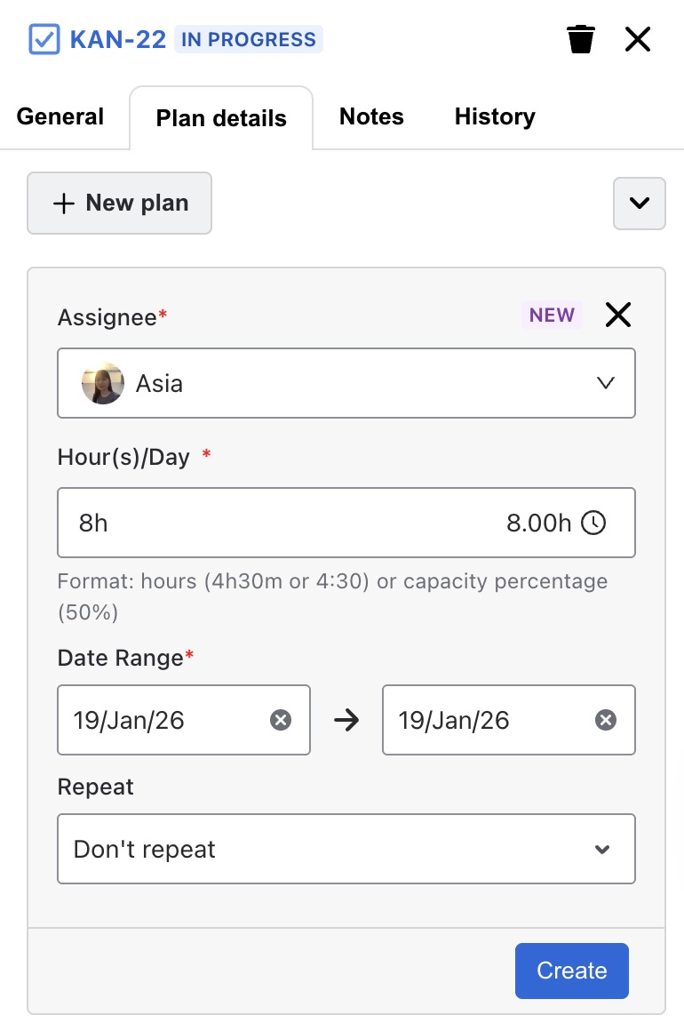 Open the Jira work item that you want to plan the task.
