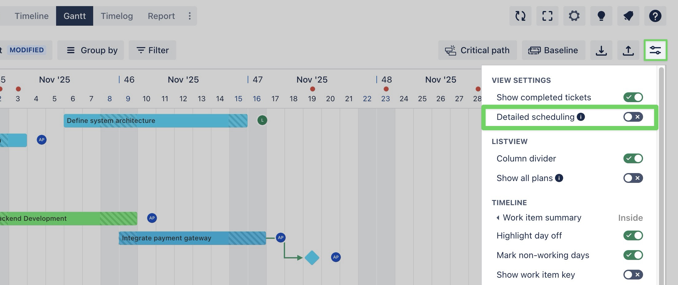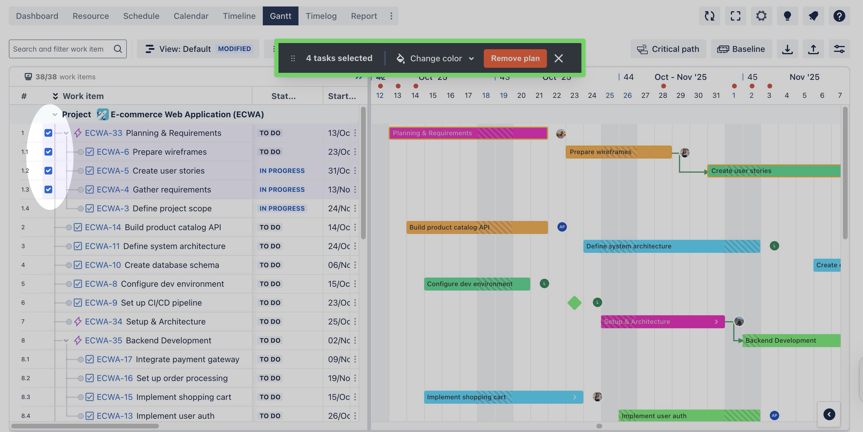You can manage tasks in both Gantt and Timeline boards using the same steps. This guide focuses on managing tasks in the Gantt Board.