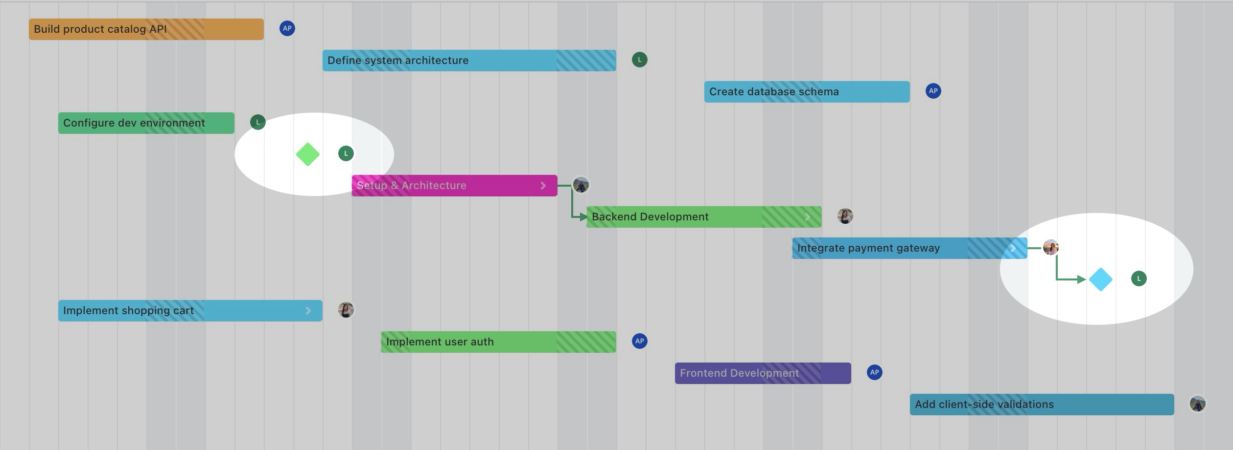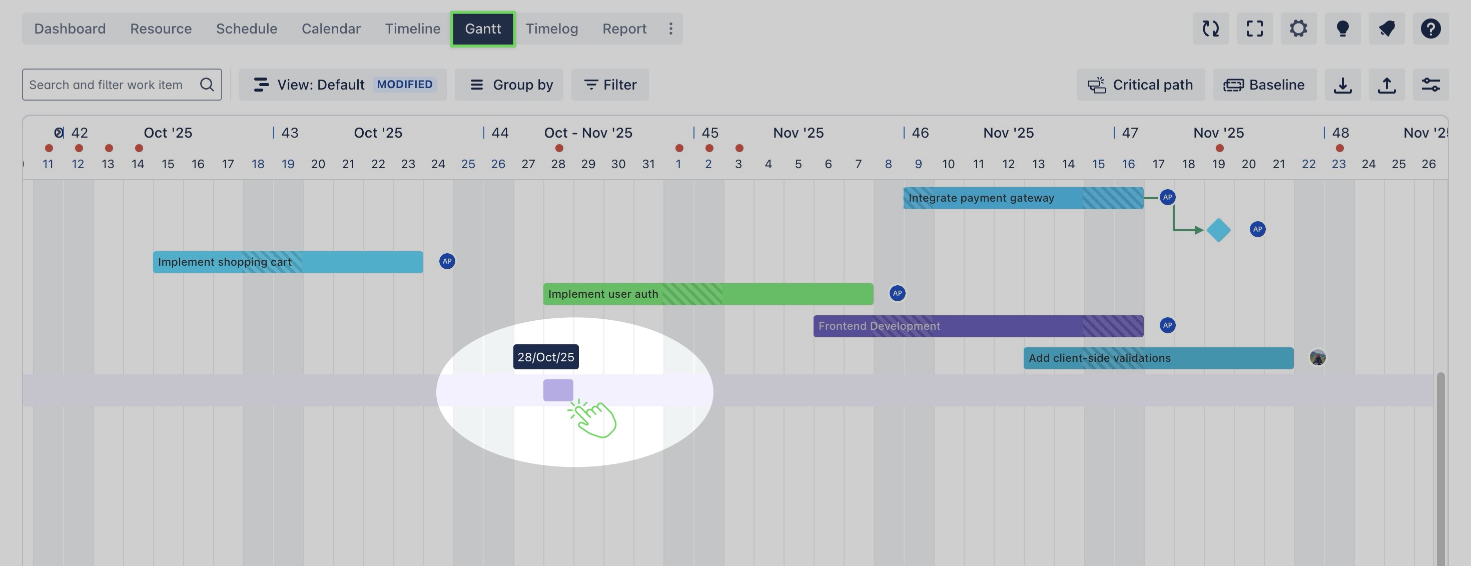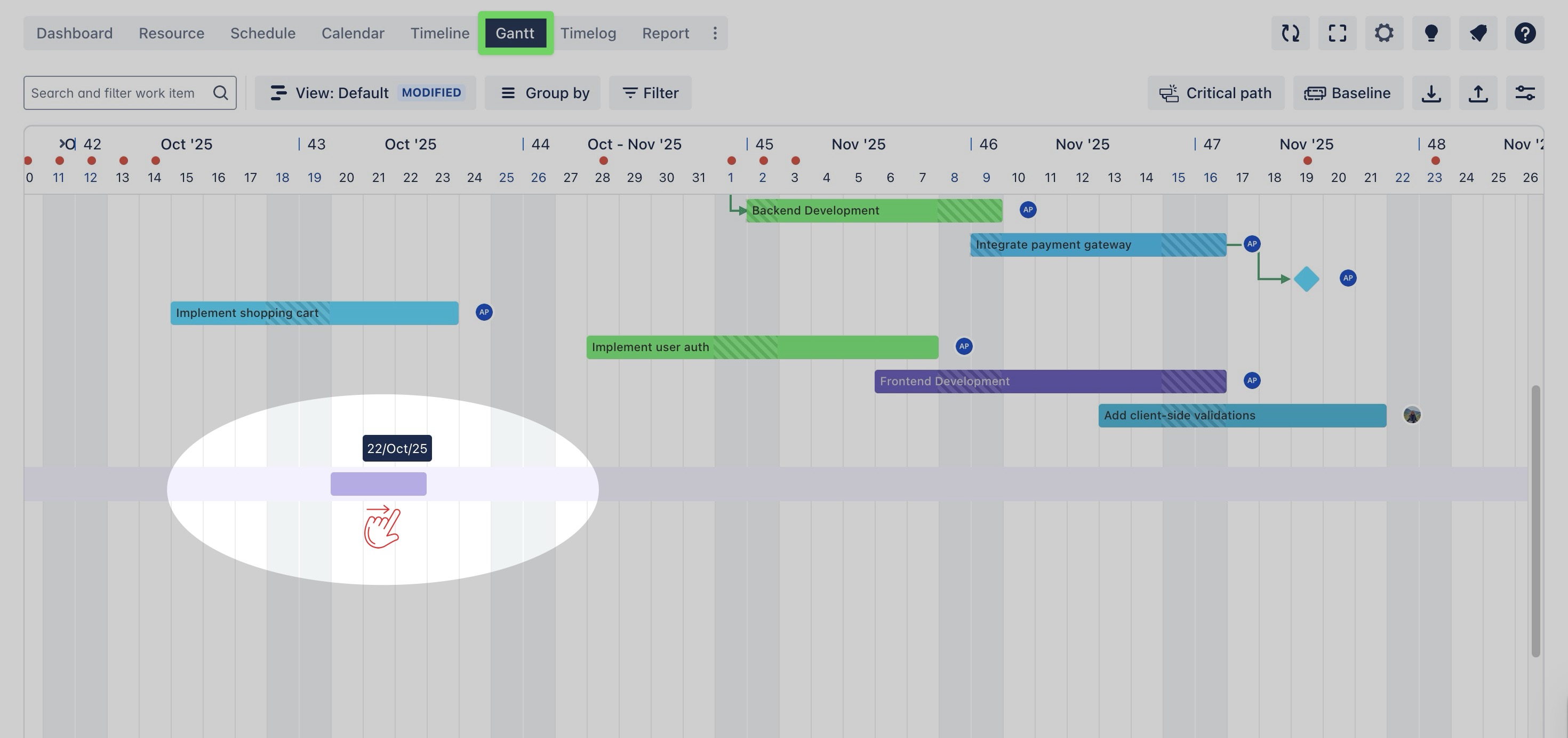 You can click on a timeline cell or drag across multiple cells directly on the timeline to rapidly plan and adjust tasks. This feature helps you save time and make the planning process more efficient, especially when scheduling tasks for larger projects.