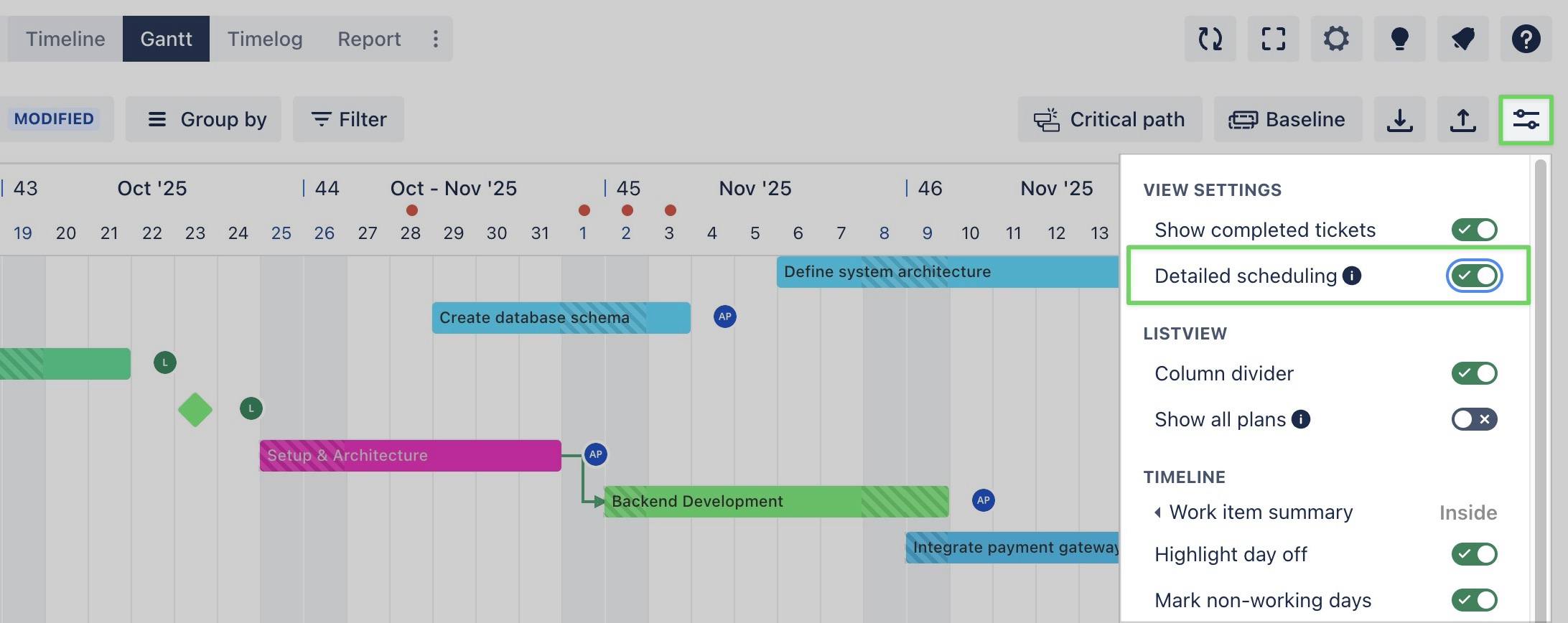 This feature is only available in the Gantt Board. In ProScheduler, the default hierarchy in the Gantt view uses Work Breakdown Structure (WBS). This hierarchy is managed within the app and does not affect the work item structure in Jira.