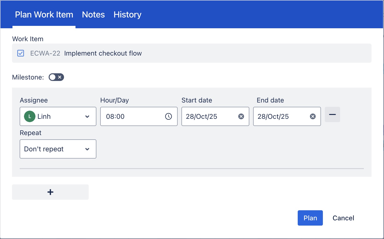 β Modify task details such as dates, assignees, and hours. | ![]() |