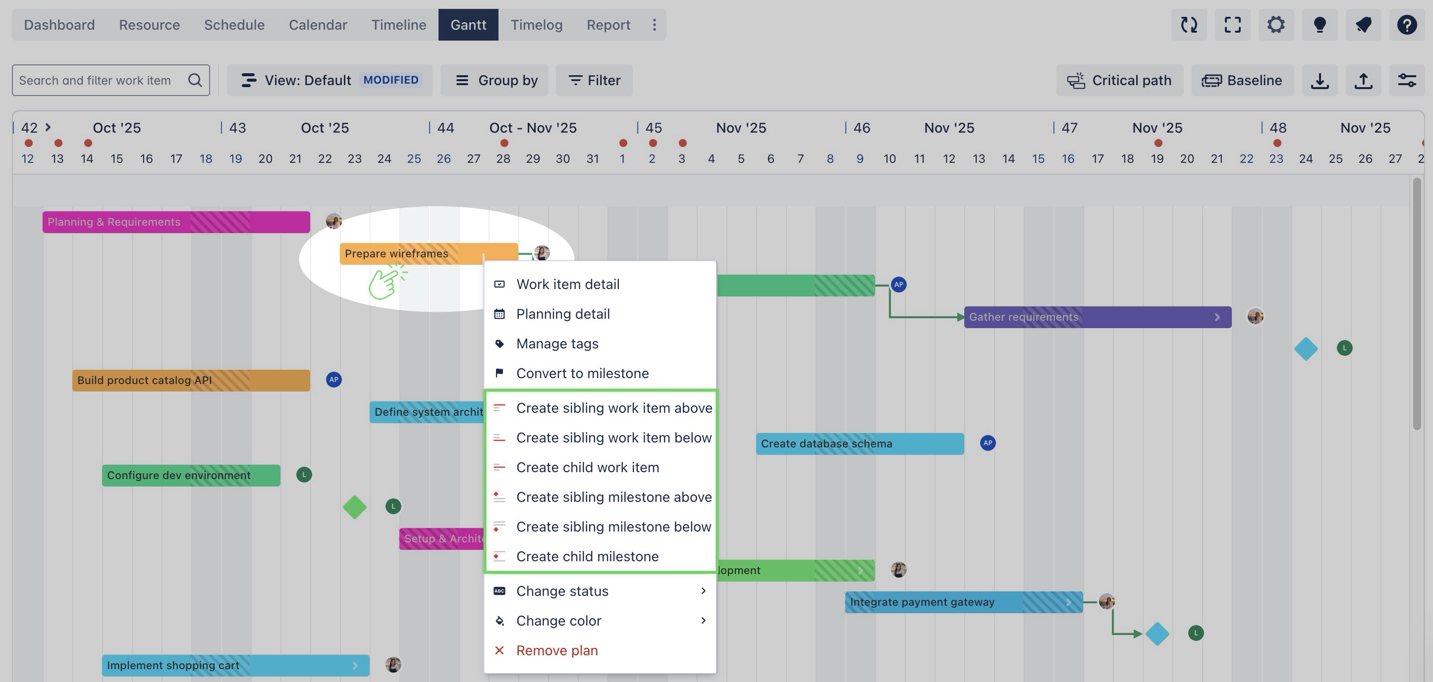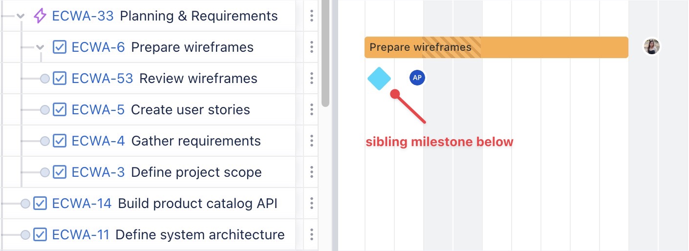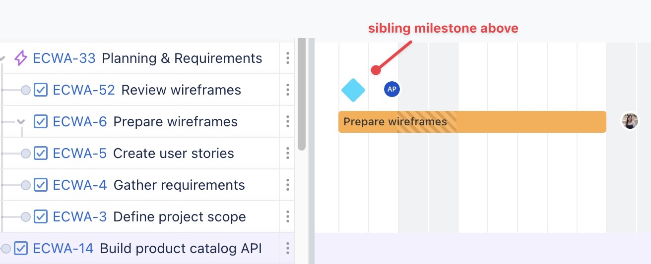 Create sibling milestone below: Adds a milestone at the same hierarchy level as the selected task, placed below it. | ![]() |
