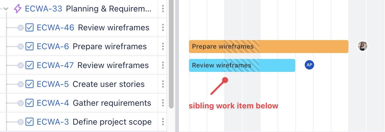 Create sibling work item below: Adds a new work item at the same hierarchy level as the selected work item, placed below it. | ![]() |