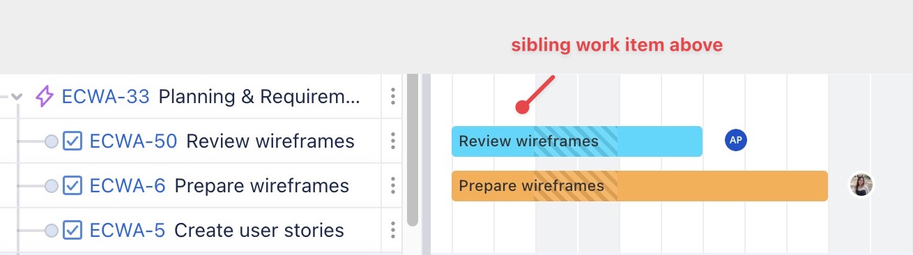 Create sibling work item above: Adds a new work item at the same hierarchy level as the selected work item, placed above it. | ![]() |