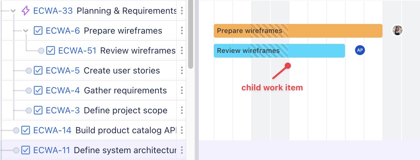 Create child work item: Adds a new work item as a child under the selected work item. | ![]() |