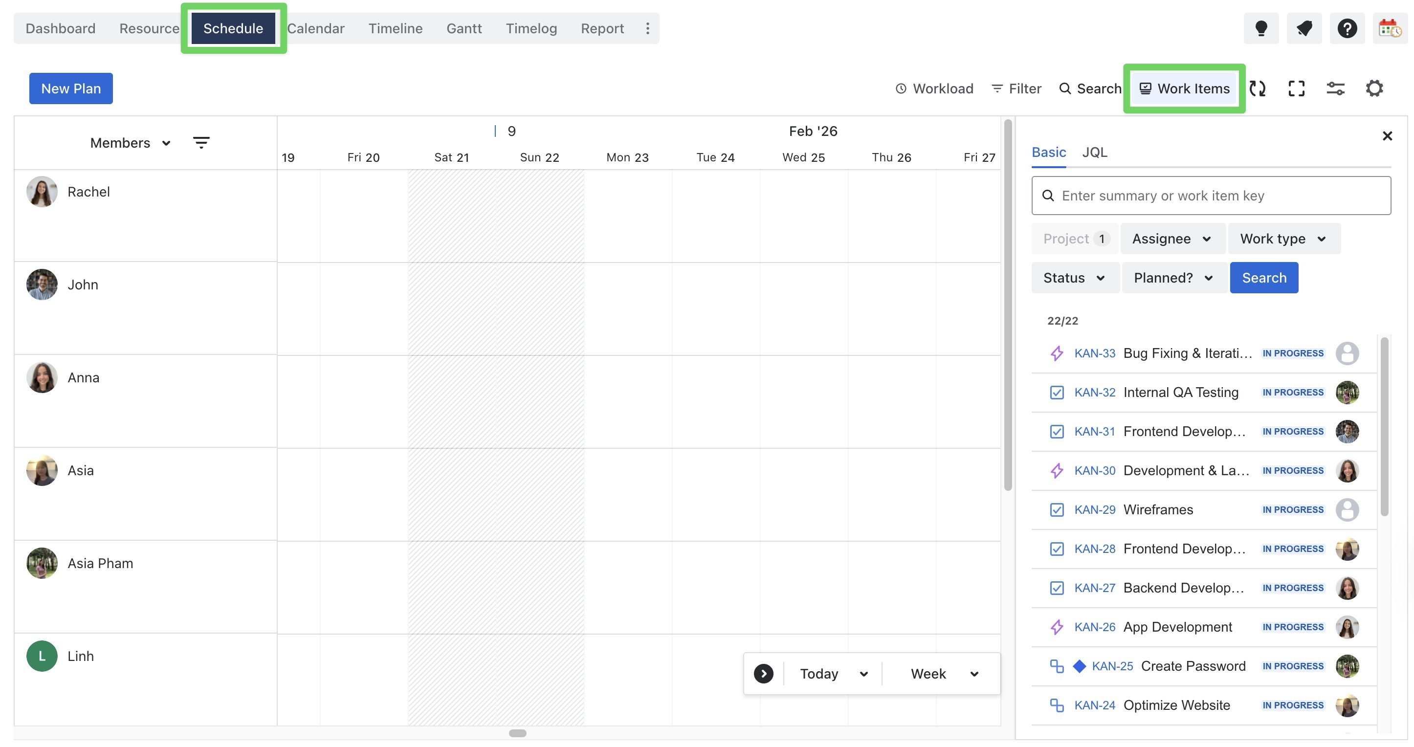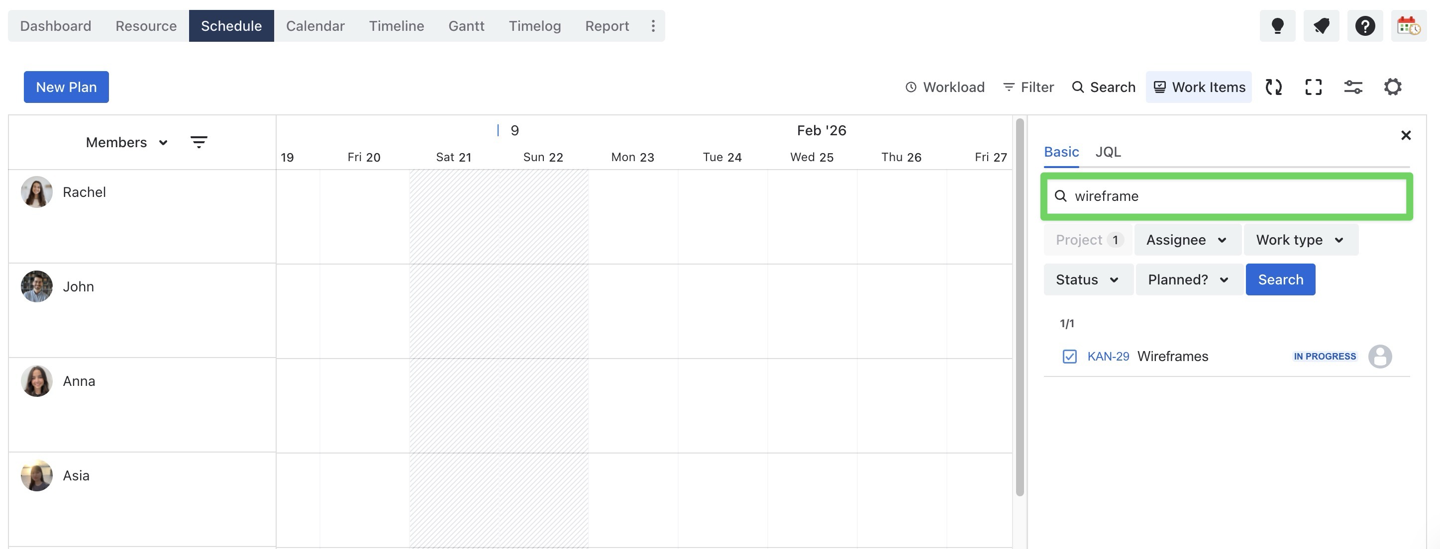 Project,Assignee,Work type,Status, orPlannedto filter tasks.JQL (Jira Query Language): For more advanced filtering, switch to the JQL tab and enter your custom query.