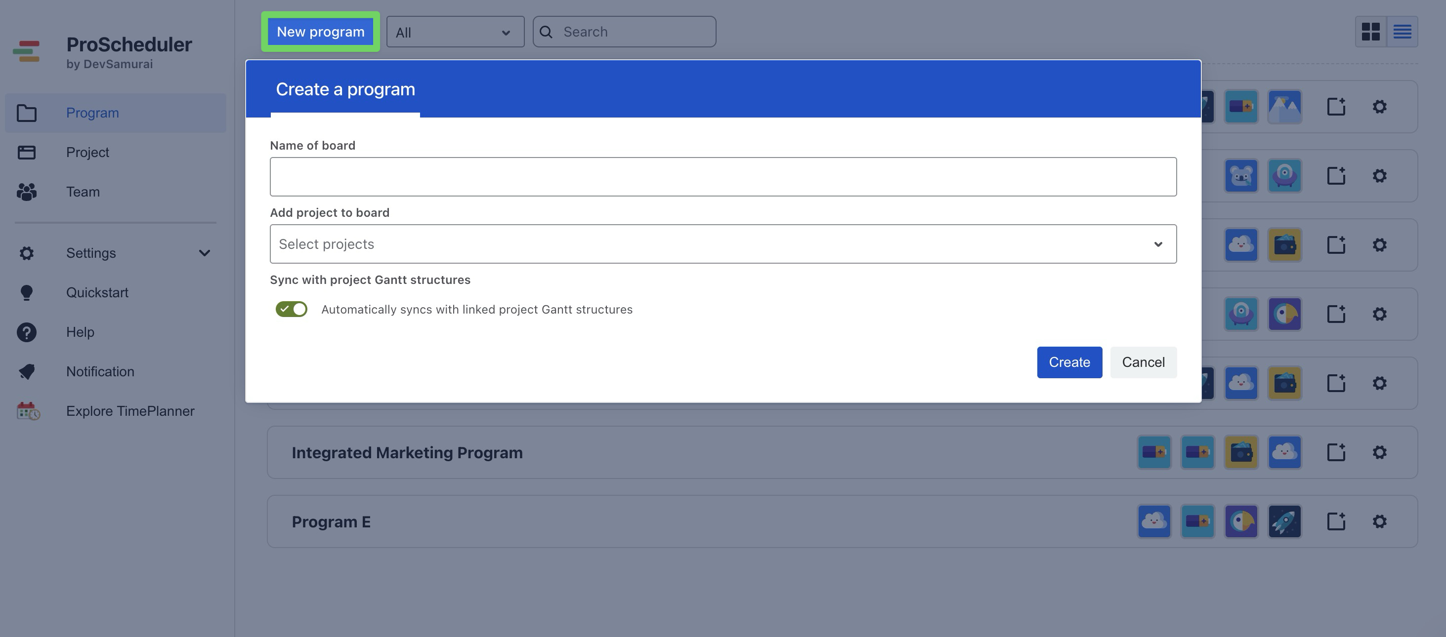 After creating a program, you can add more projects by clicking