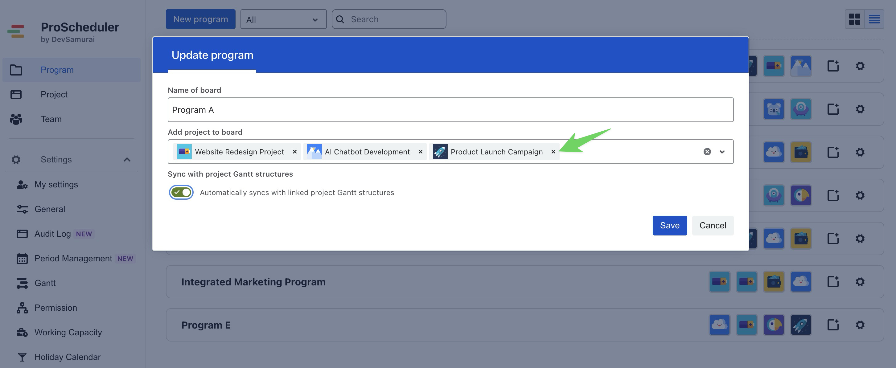 When ‘Automatically syncs with linked project Gantt structures’ is enabled, you can add a maximum of 50 projects to a Program.