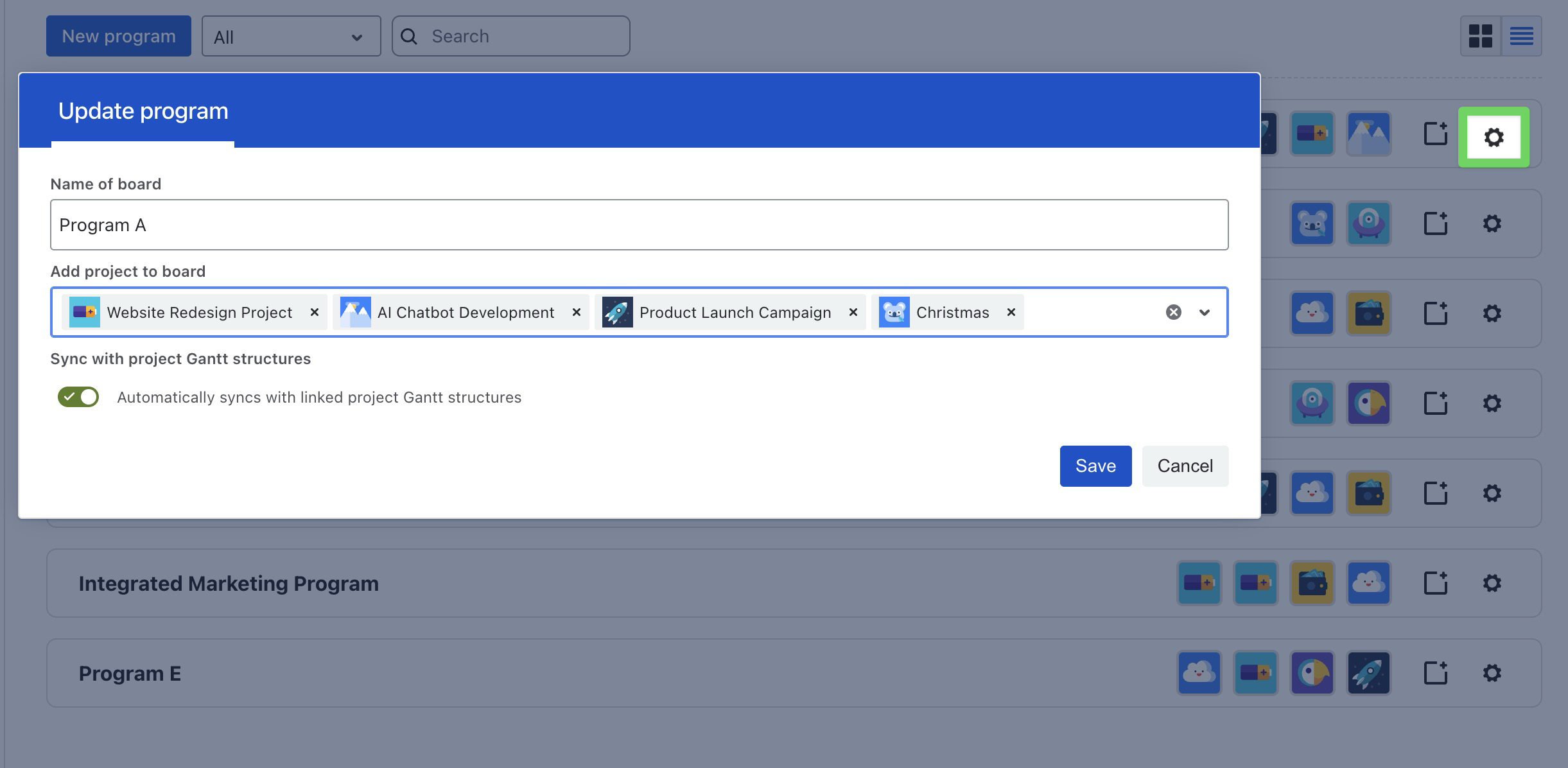 You can update an existing Program to modify its name, project scope, or synchronization settings.
