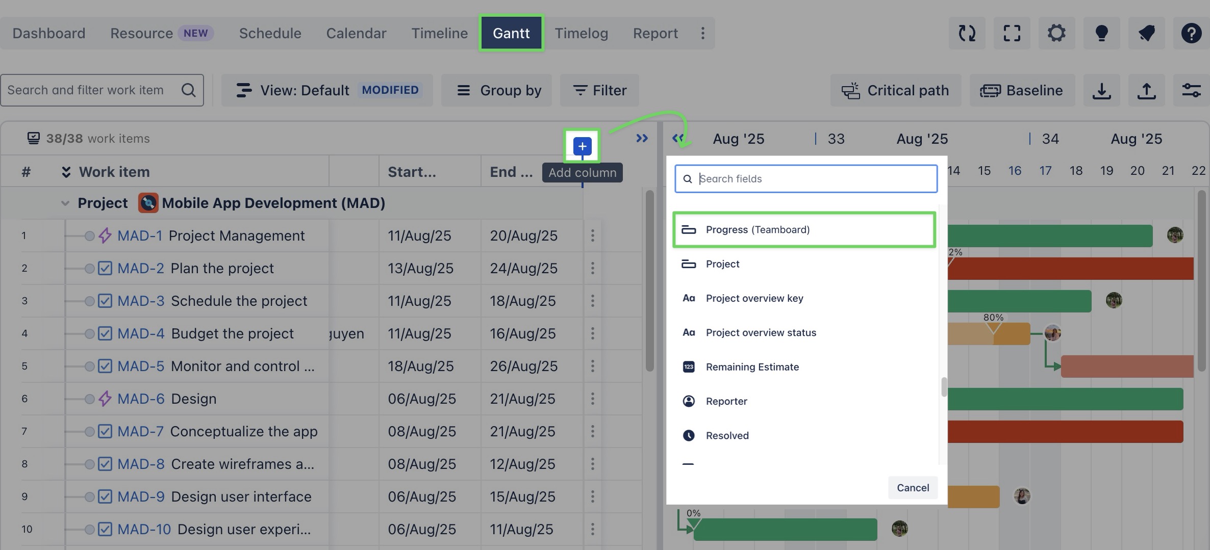 Click on Progress (Teamboard) to add it to your Gantt Column Views.