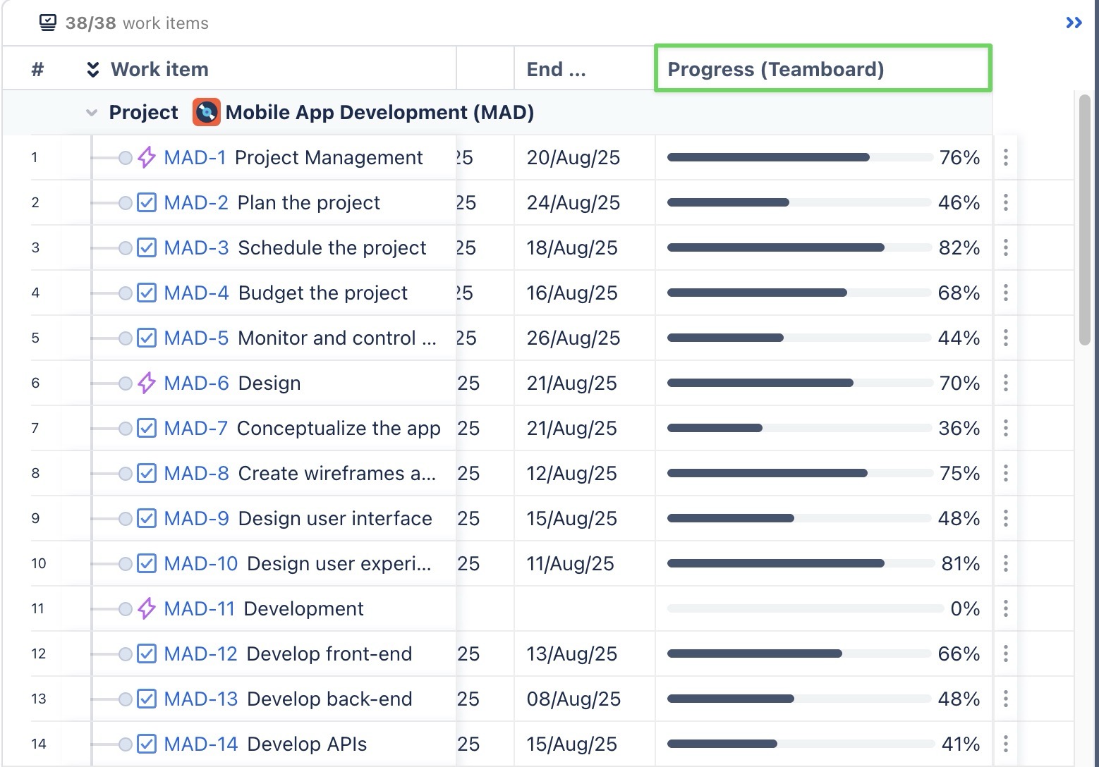 Progress (Teamboard) column: Displays the completion percentage for each task based on your selected progress settings.