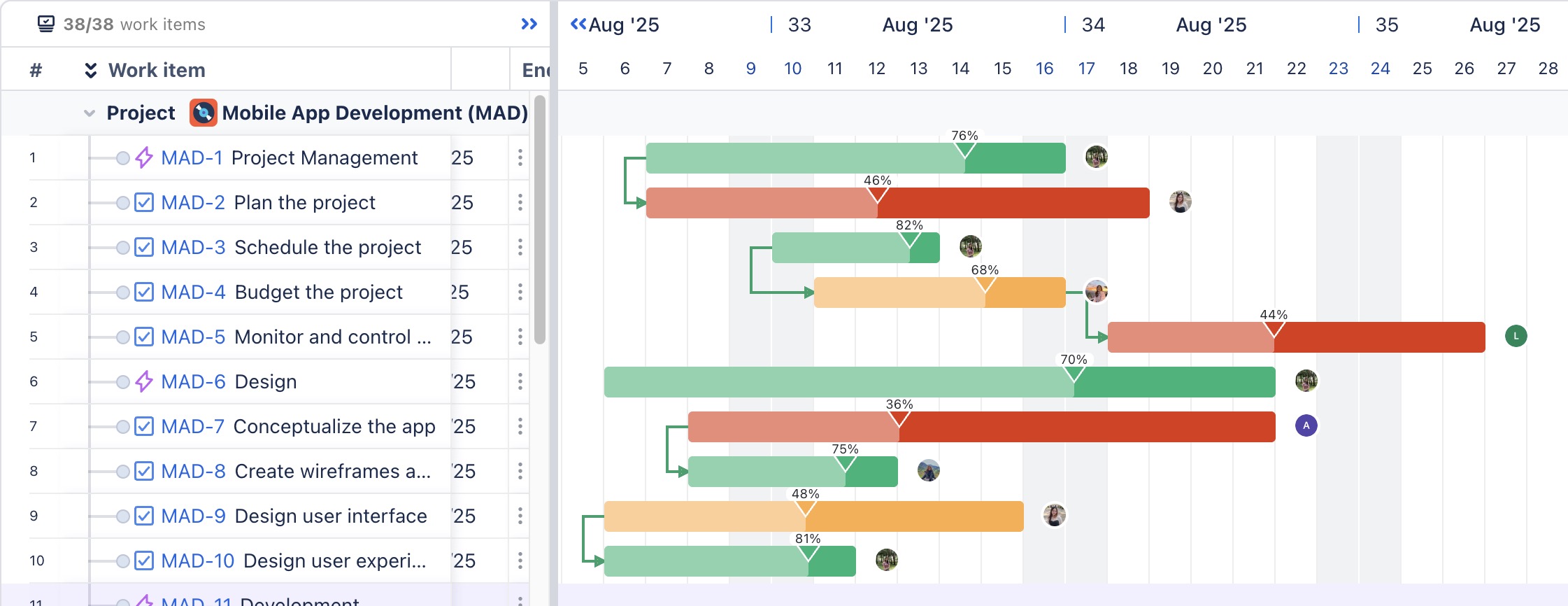 The Gantt chart will reflect progress according to the selected method’s logic as shown below: