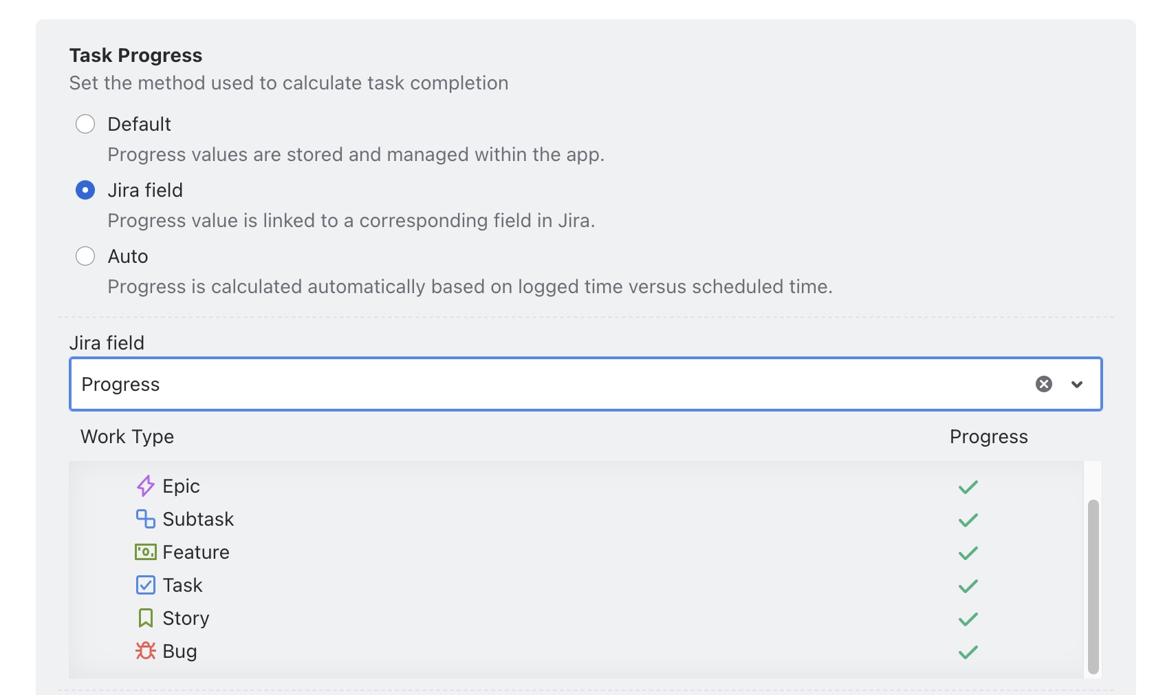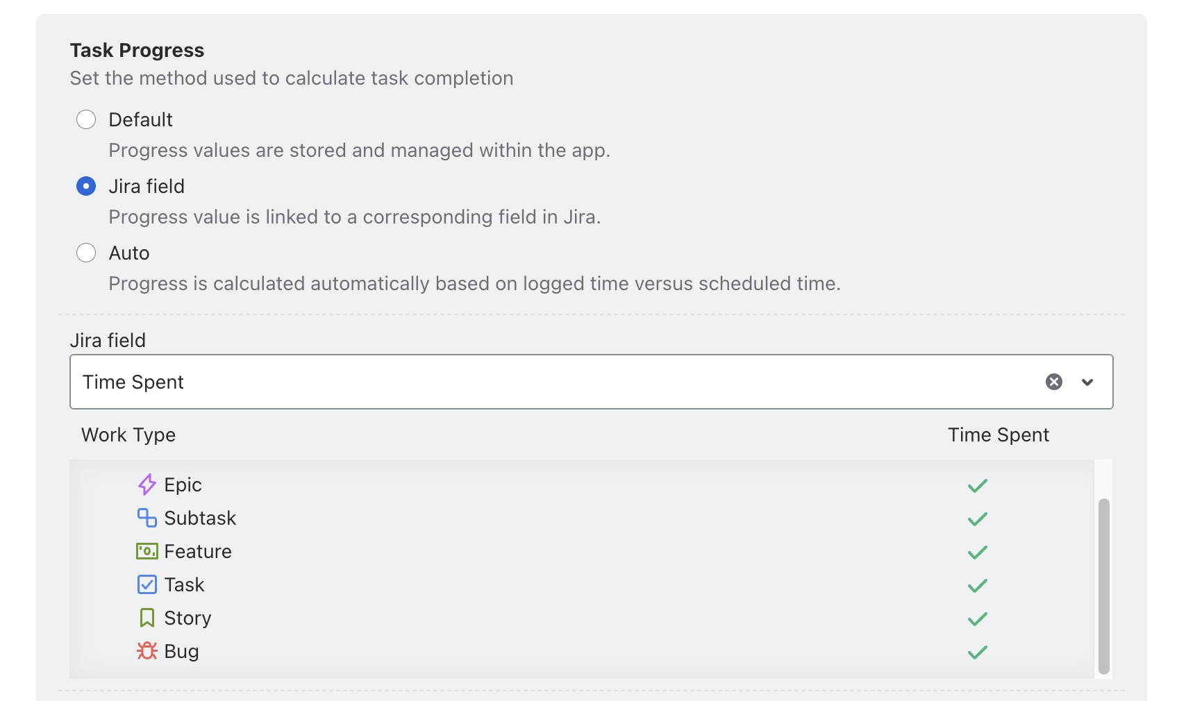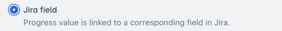 Jira Field: Task progress is automatically calculated based on values from a linked Jira field (e.g., Time Spent, Number fields).