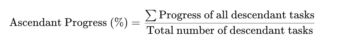 Ascendant progress is calculated as the sum of the progress of all descendant tasks divided by the total number of descendant tasks that contribute to the ascendant.