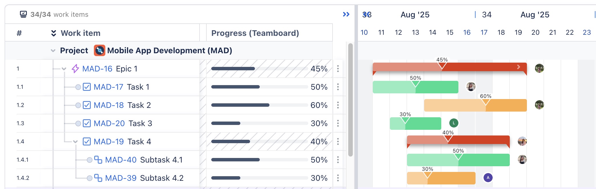 TeamBoard ProScheduler supports automatic progress calculation using Jira’s Time Spent fields. Use this method when your team relies on Jira time tracking to measure task completion.