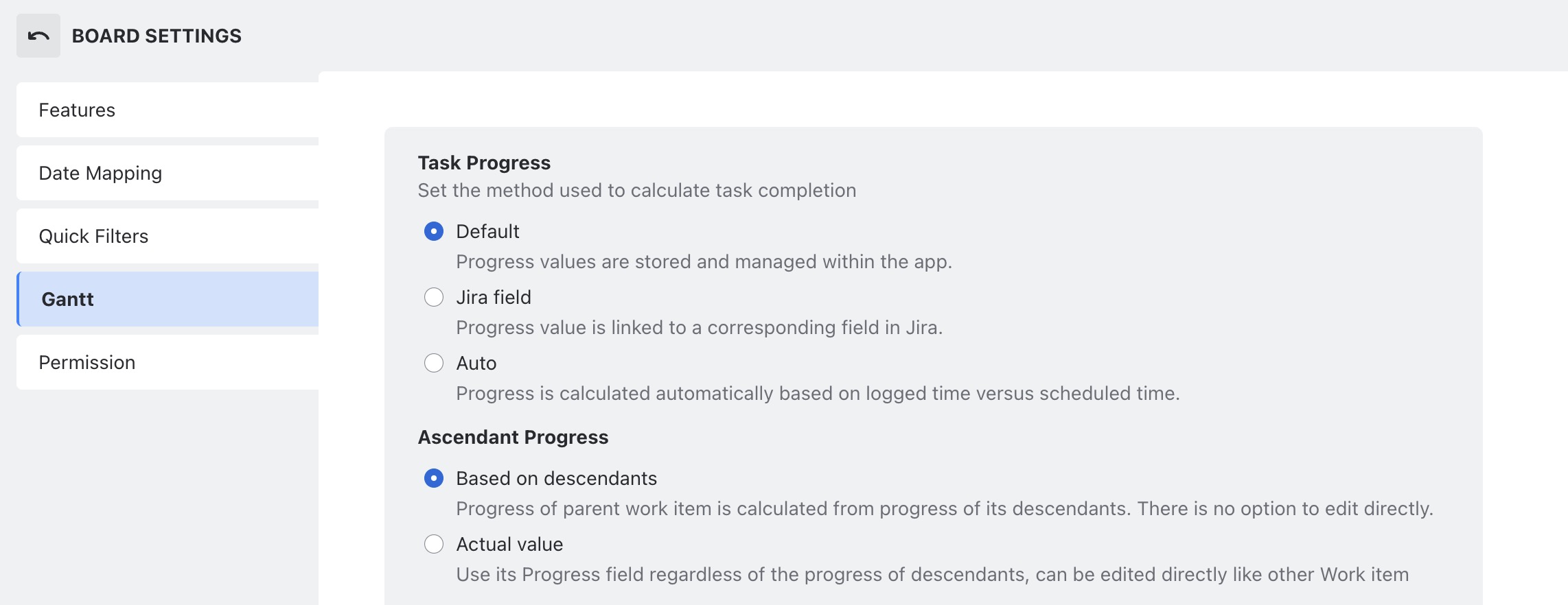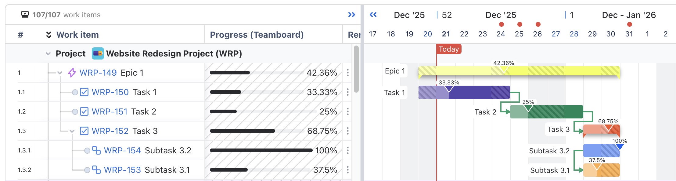 You can link a Jira custom number field (with values from 0 to 100) to represent the percentage of task completion. Any updates made in Jira or by dragging the progress slider in the Gantt chart are reflected immediately.