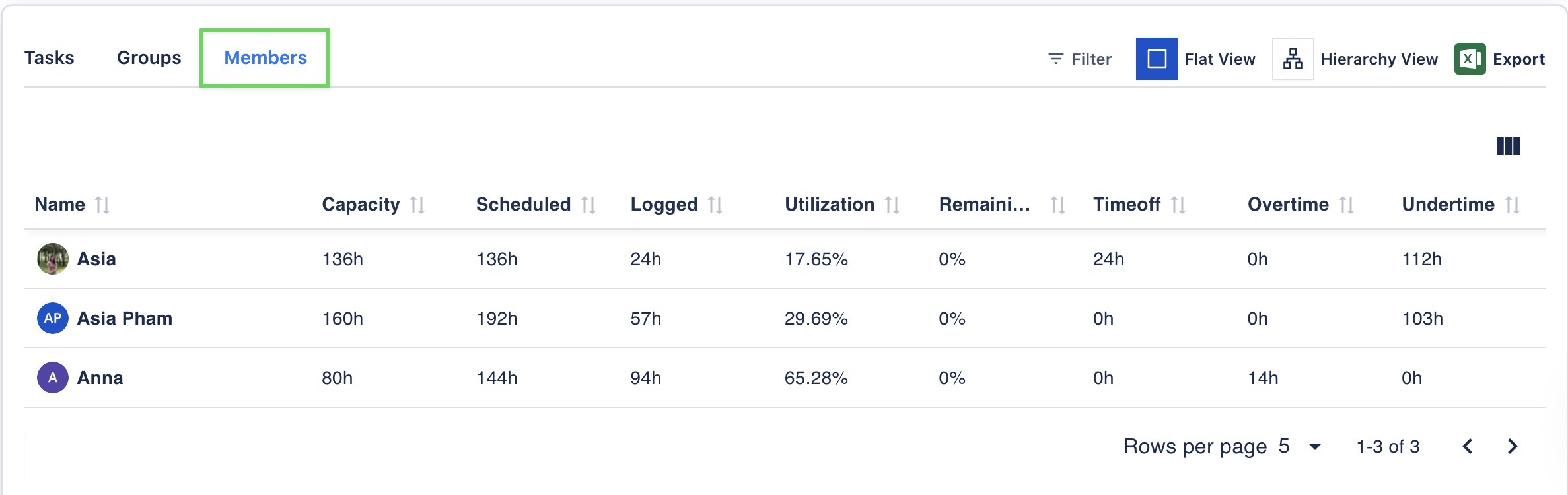 The Member Report focuses on individual team members. It displays detailed data on each personβs capacity, scheduled hours, logged hours, time off, and overtime.