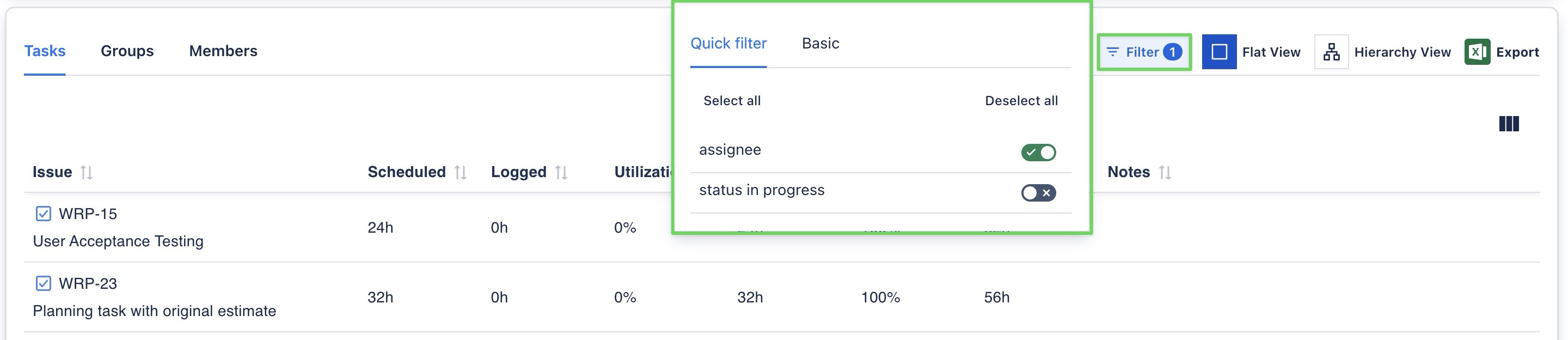 Basic Filters: Customize reports by selecting specific criteria, such as task status, assignee, or date range.