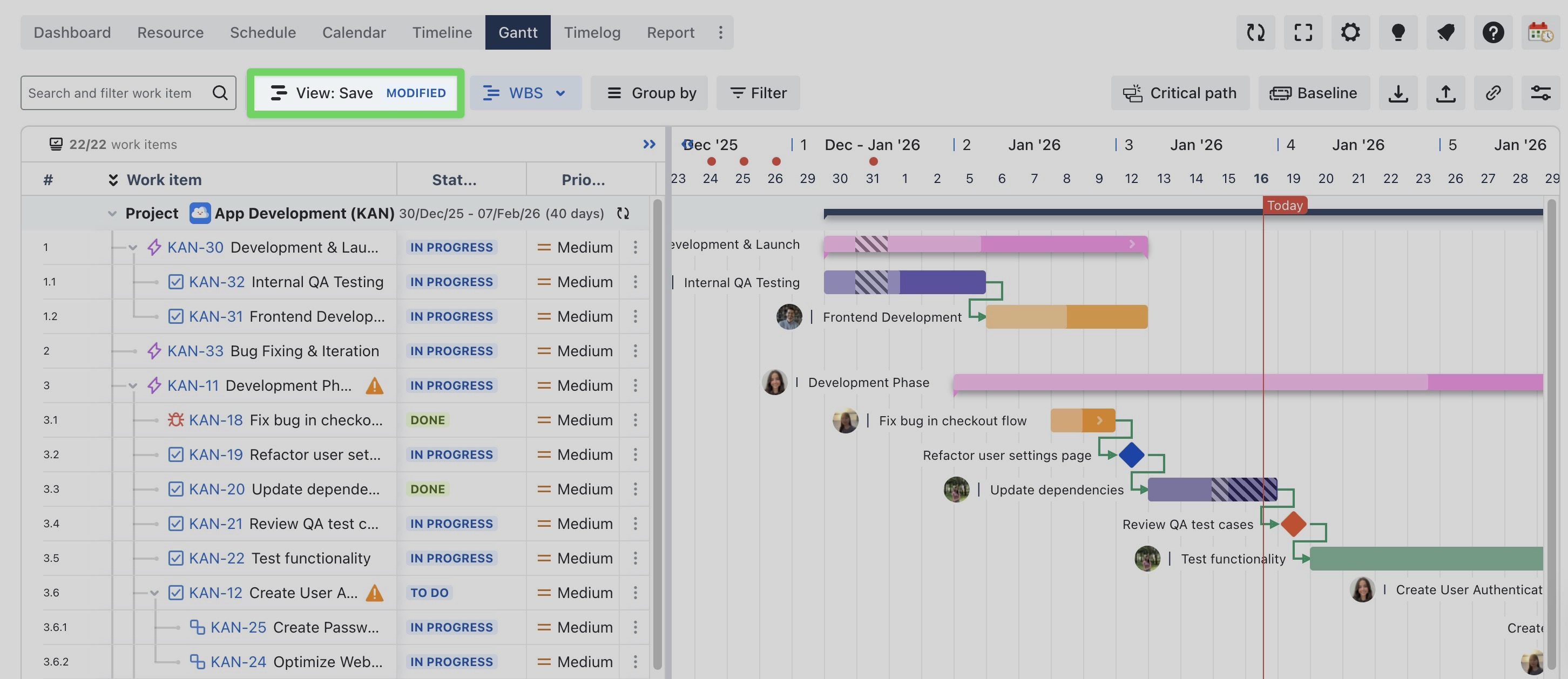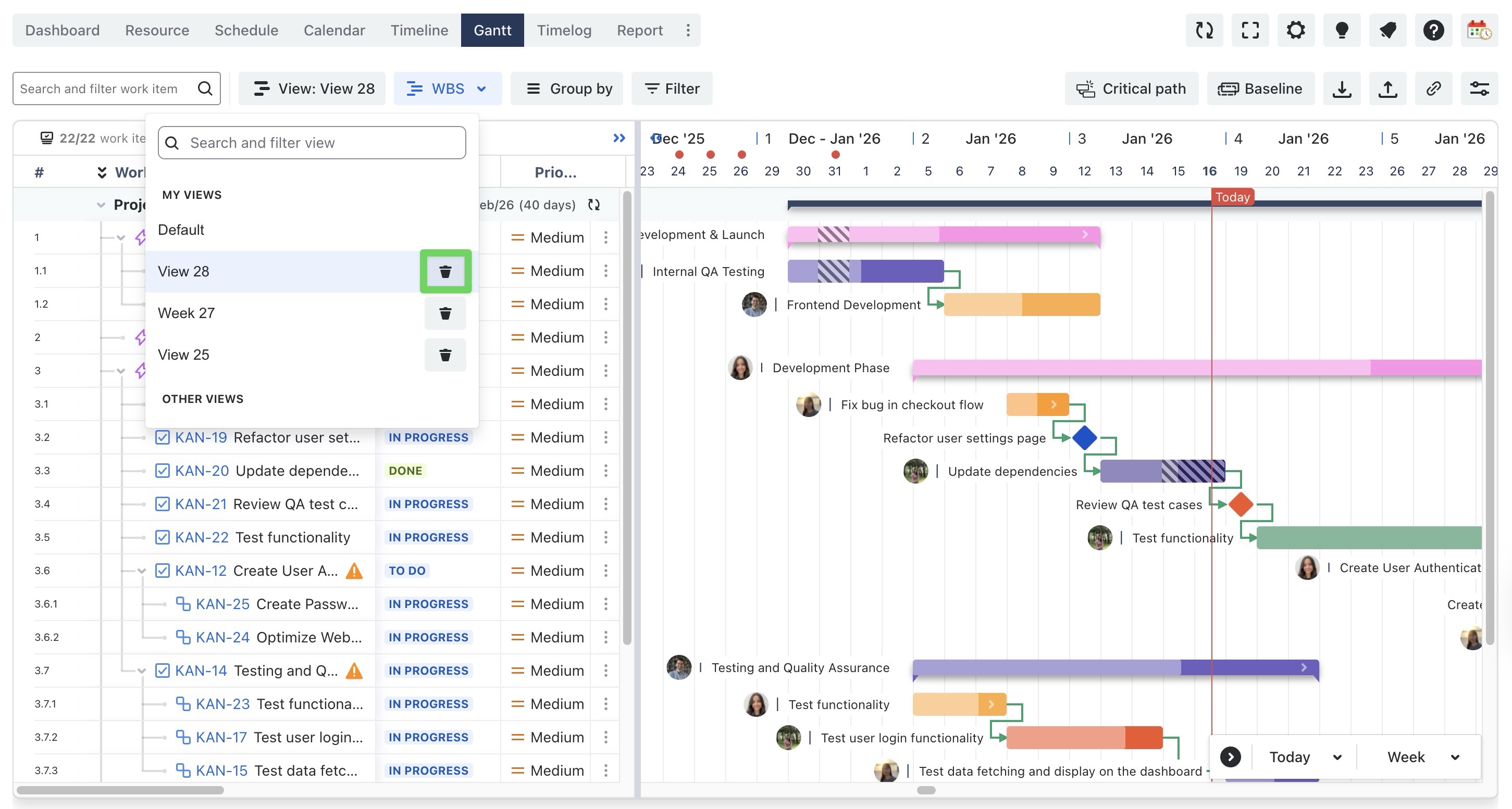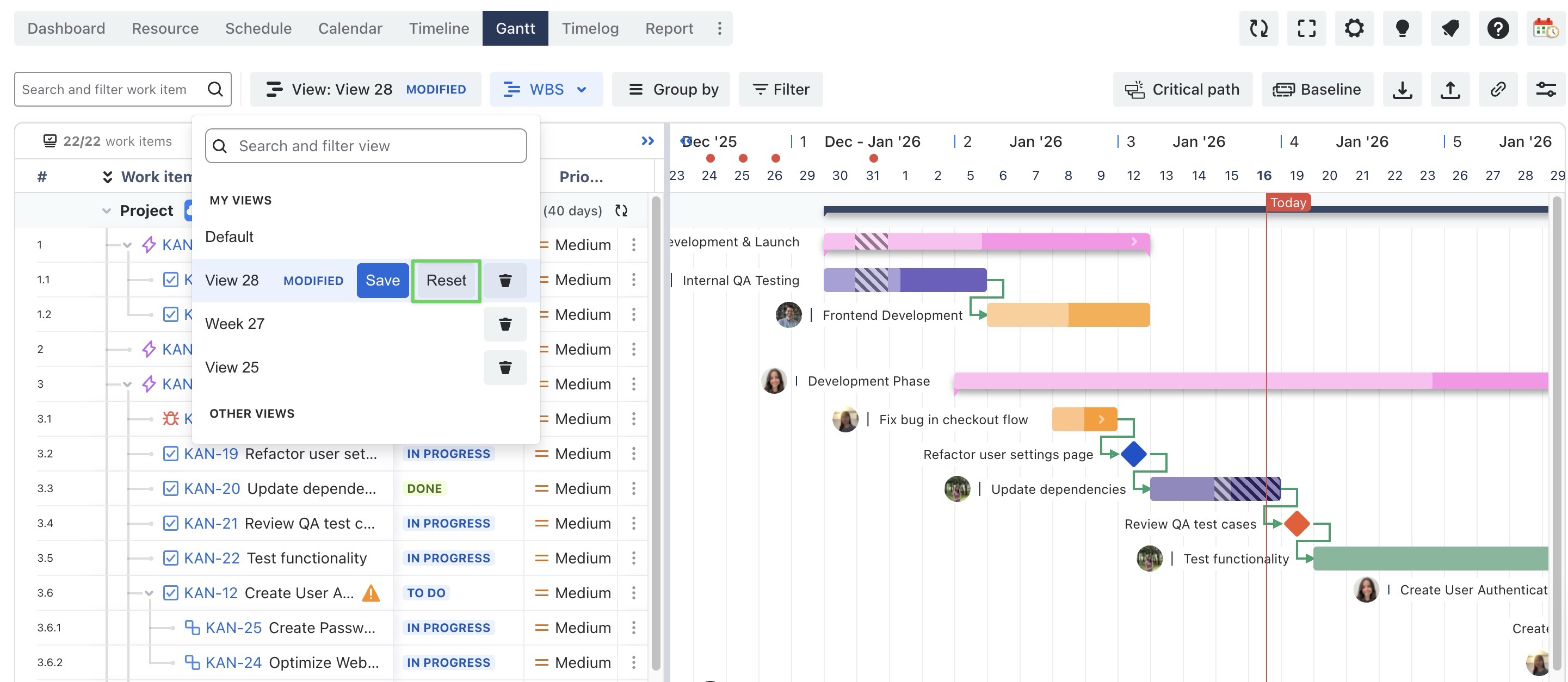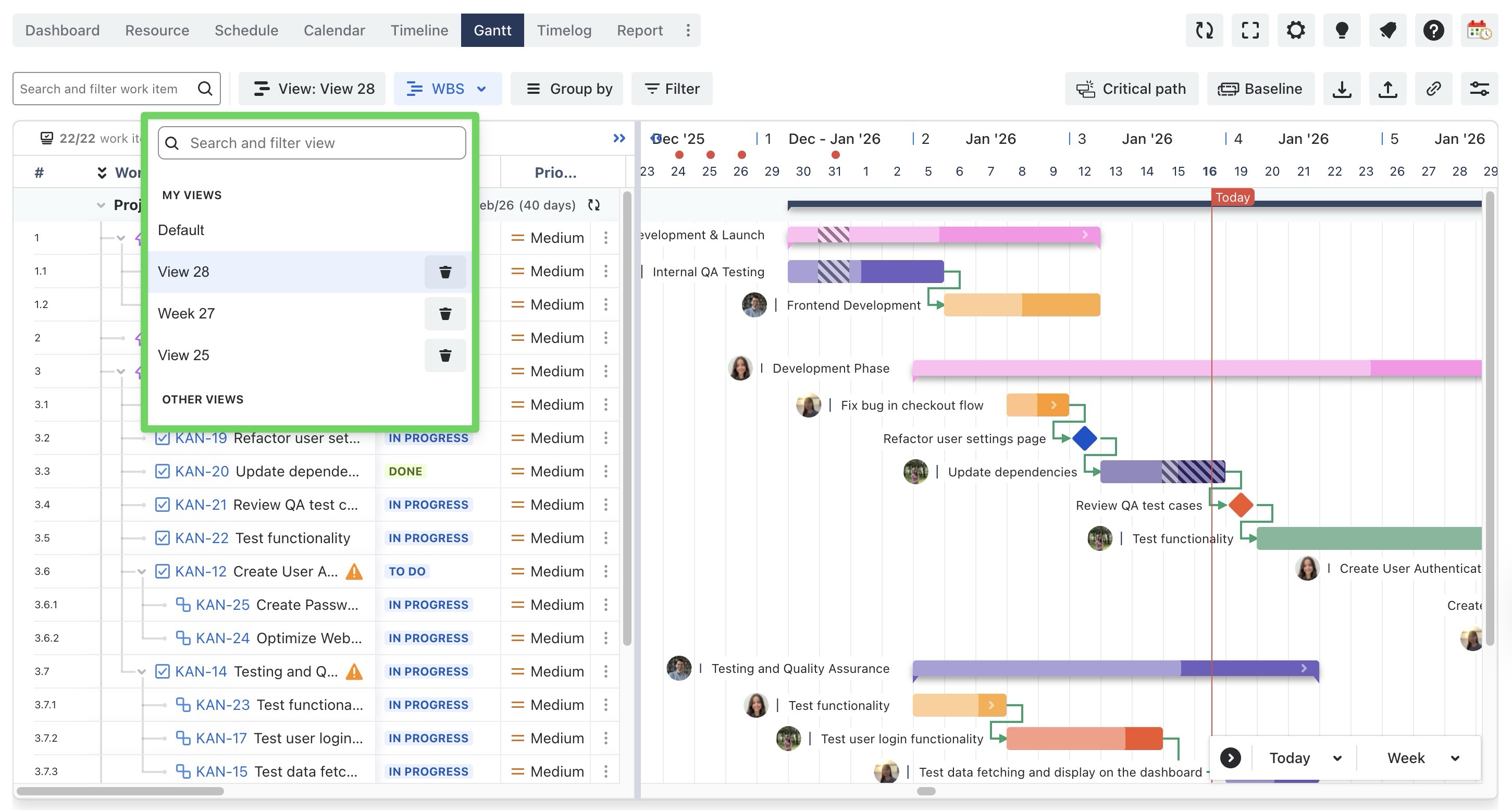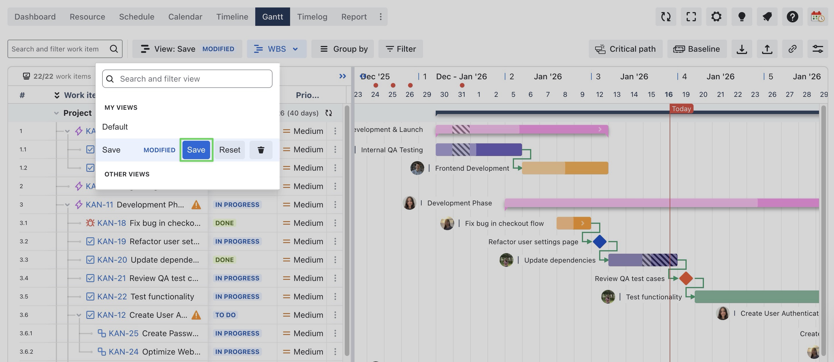 View dropdown in the Gantt toolbar.Select any saved view from the My Views section to instantly change to your preferred layout or filter.