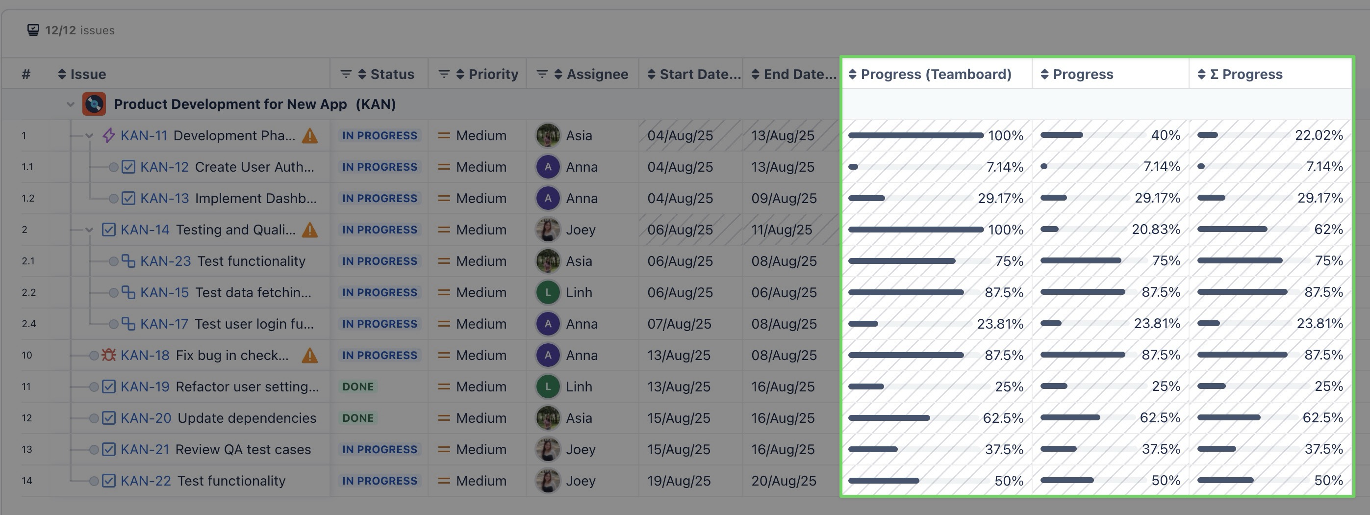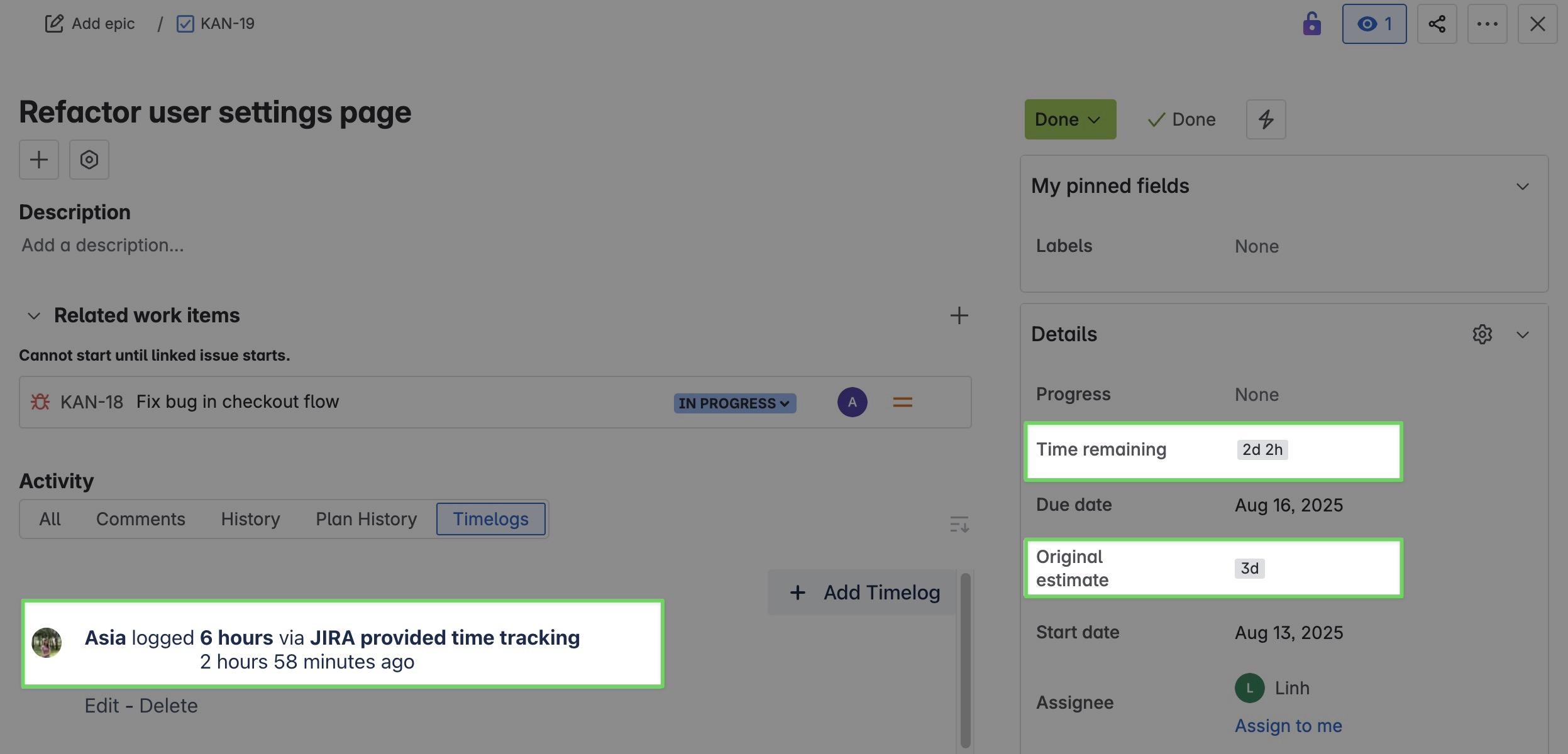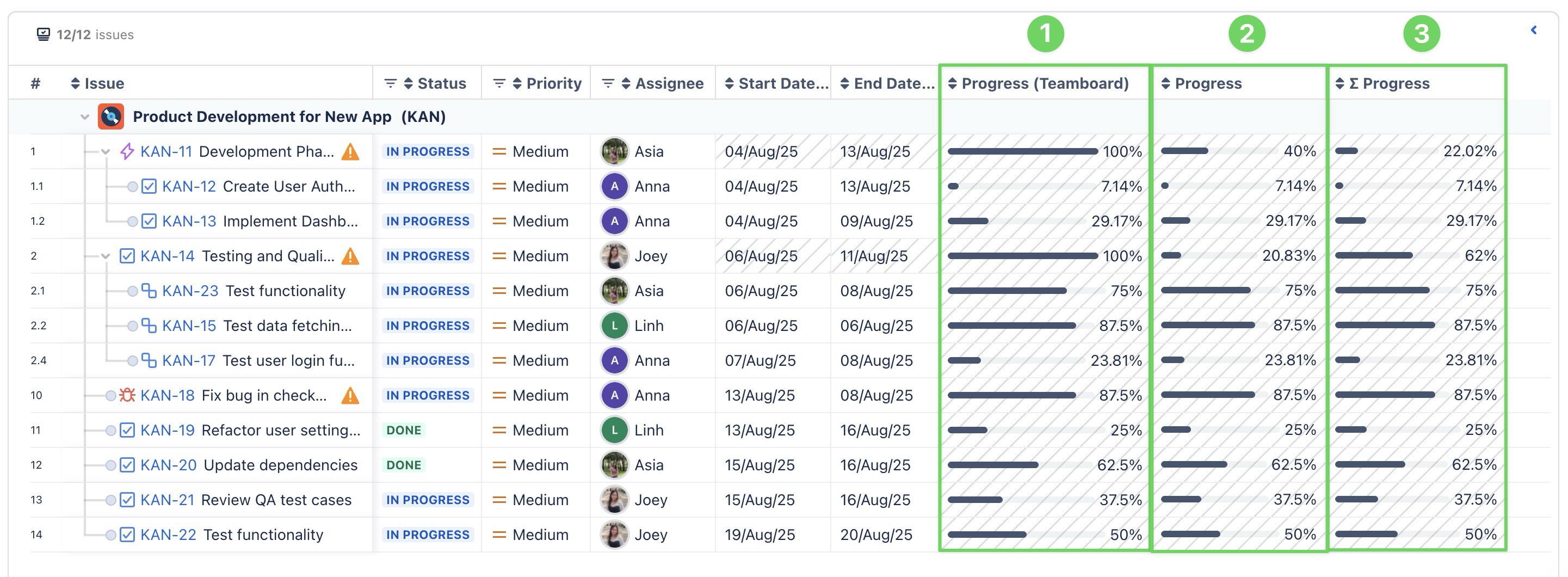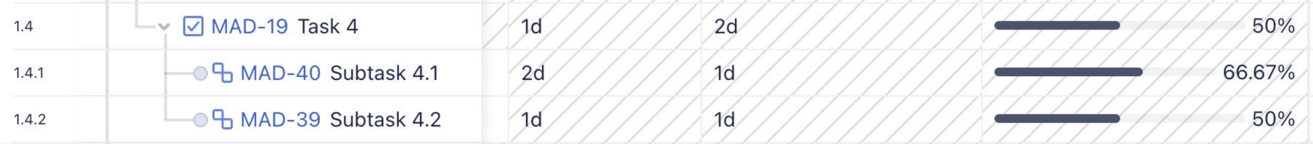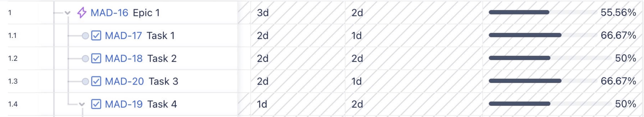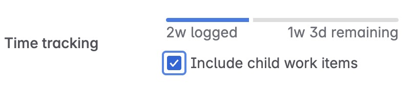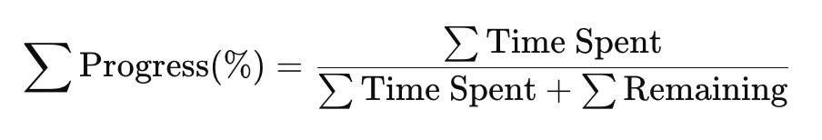 ∑ Progress: When a parent work item has linked child work items, Jira calculates the overall progress of the parent by aggregating the time tracking data of both the parent and all its child work items. This approach ensures an accurate representation of progress across the hierarchy.