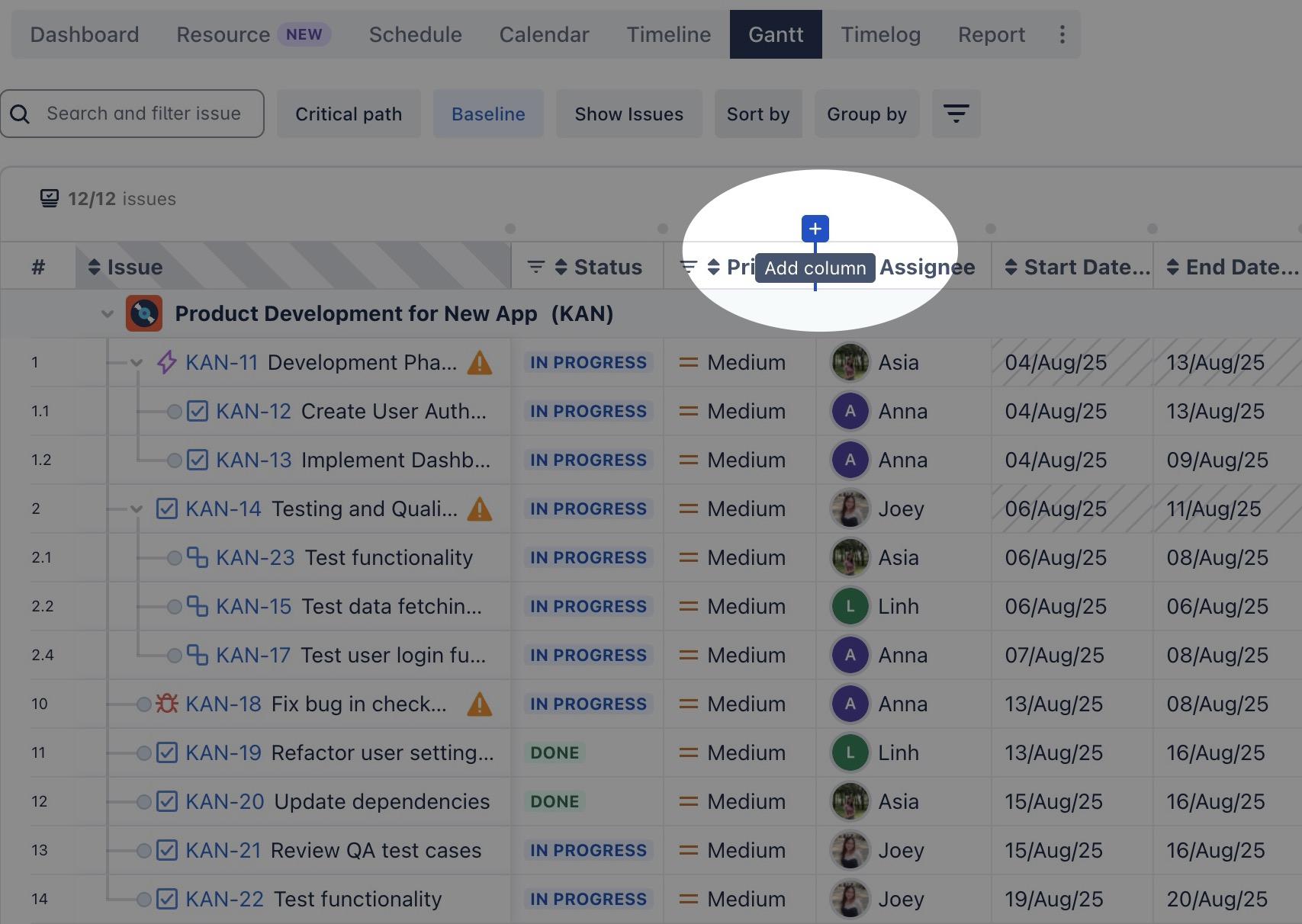 From the Gantt table > click the ➕ button that appears on the right side of that column header.
