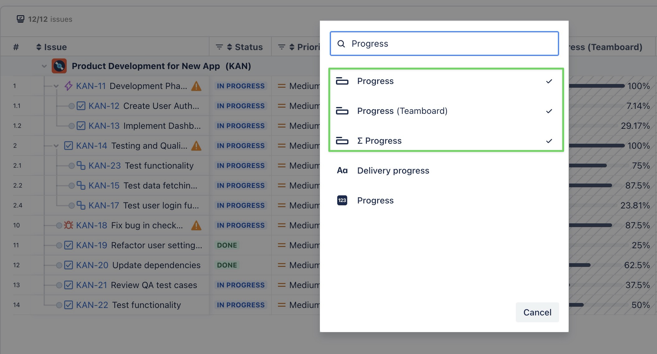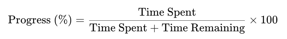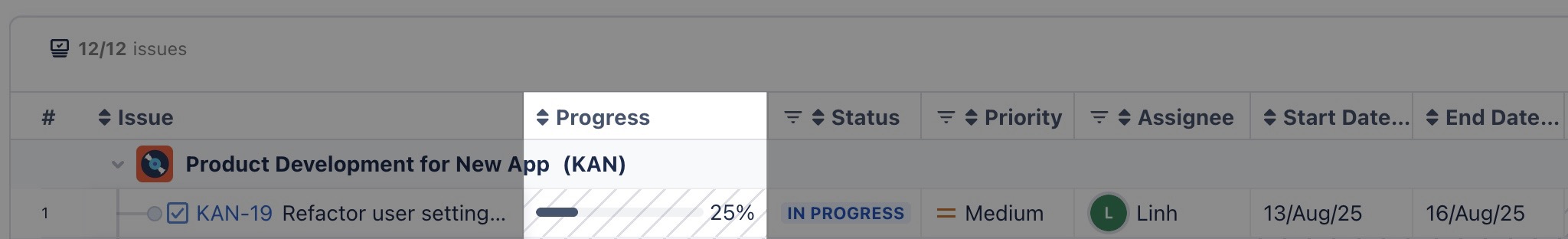 Progress: This field reflects the progress of a work item, calculated by Jira using its native time tracking mechanism. It provides an accurate measure of progress based on Jira’s time tracking data.