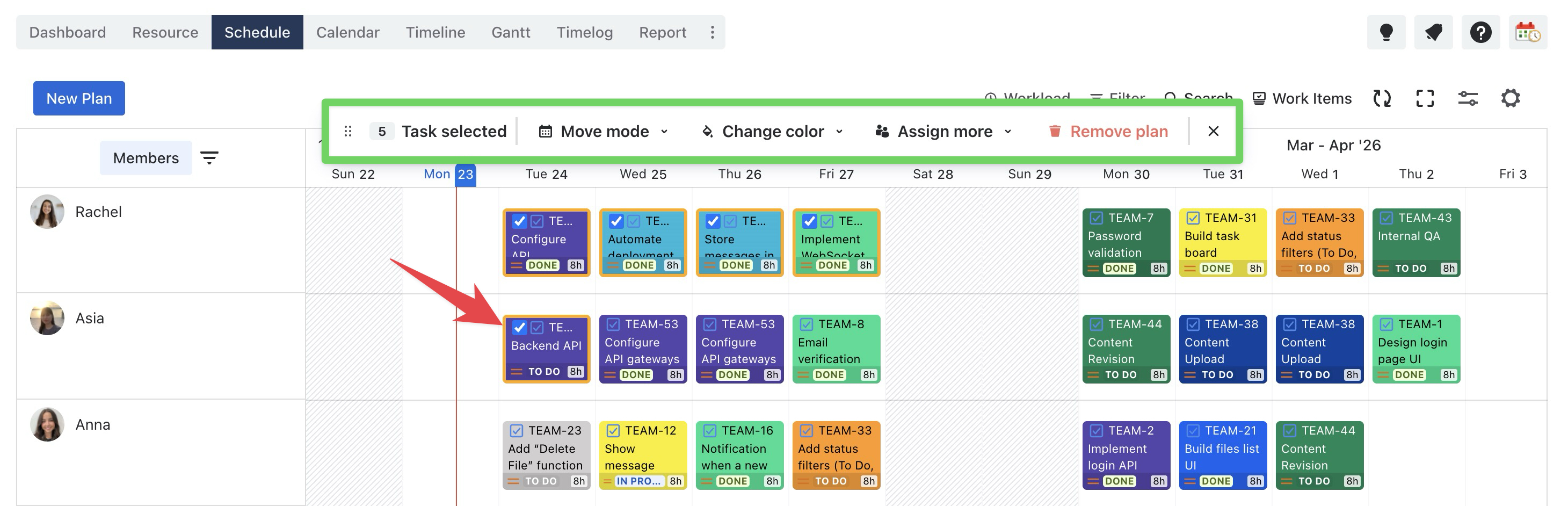 You can easily update a task’s schedule or assignee by dragging and dropping the task card on the Schedule Board. This intuitive drag-and-drop functionality helps you quickly make updates and keep your project on track.