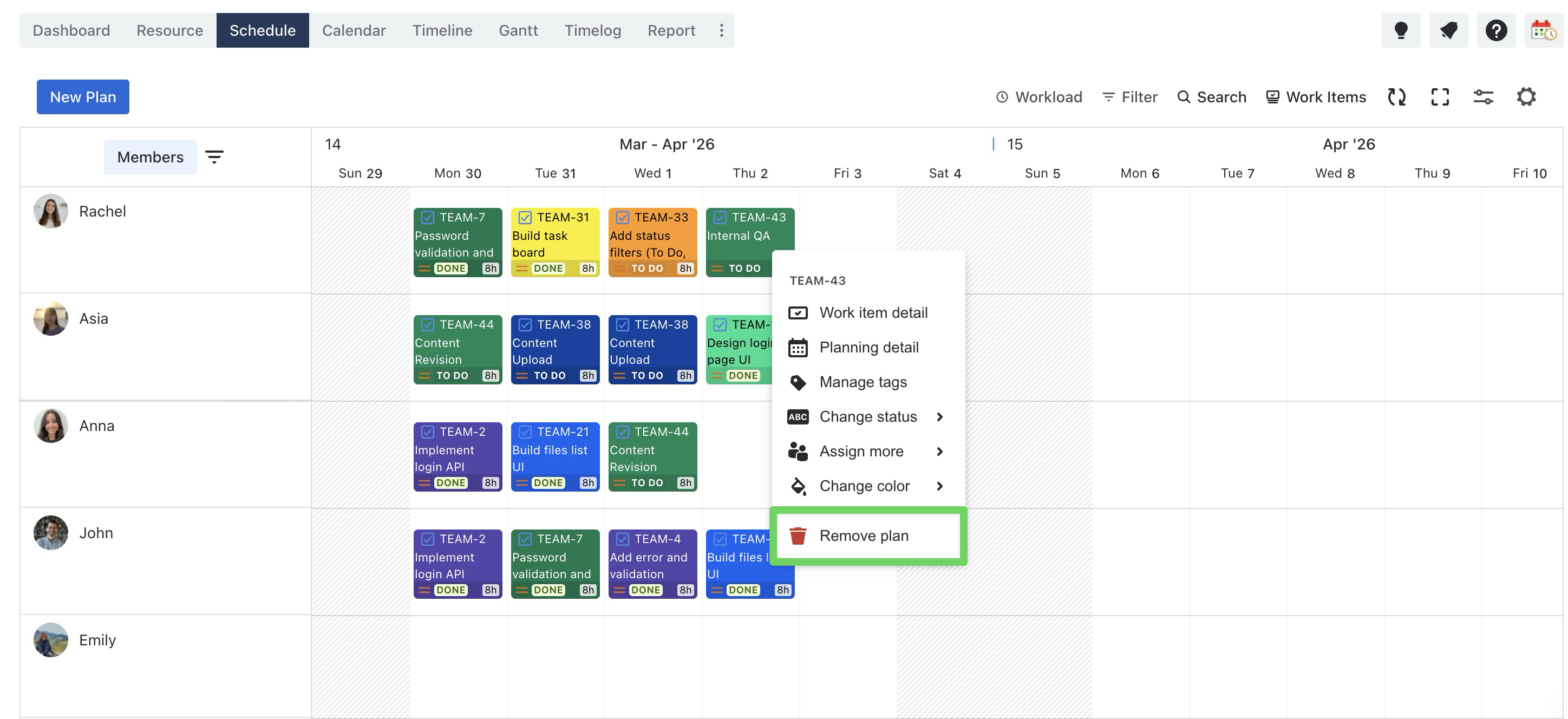 When you remove a plan from the Schedule Board, it only removes the task from the board view — it does not delete the Jira issue.
