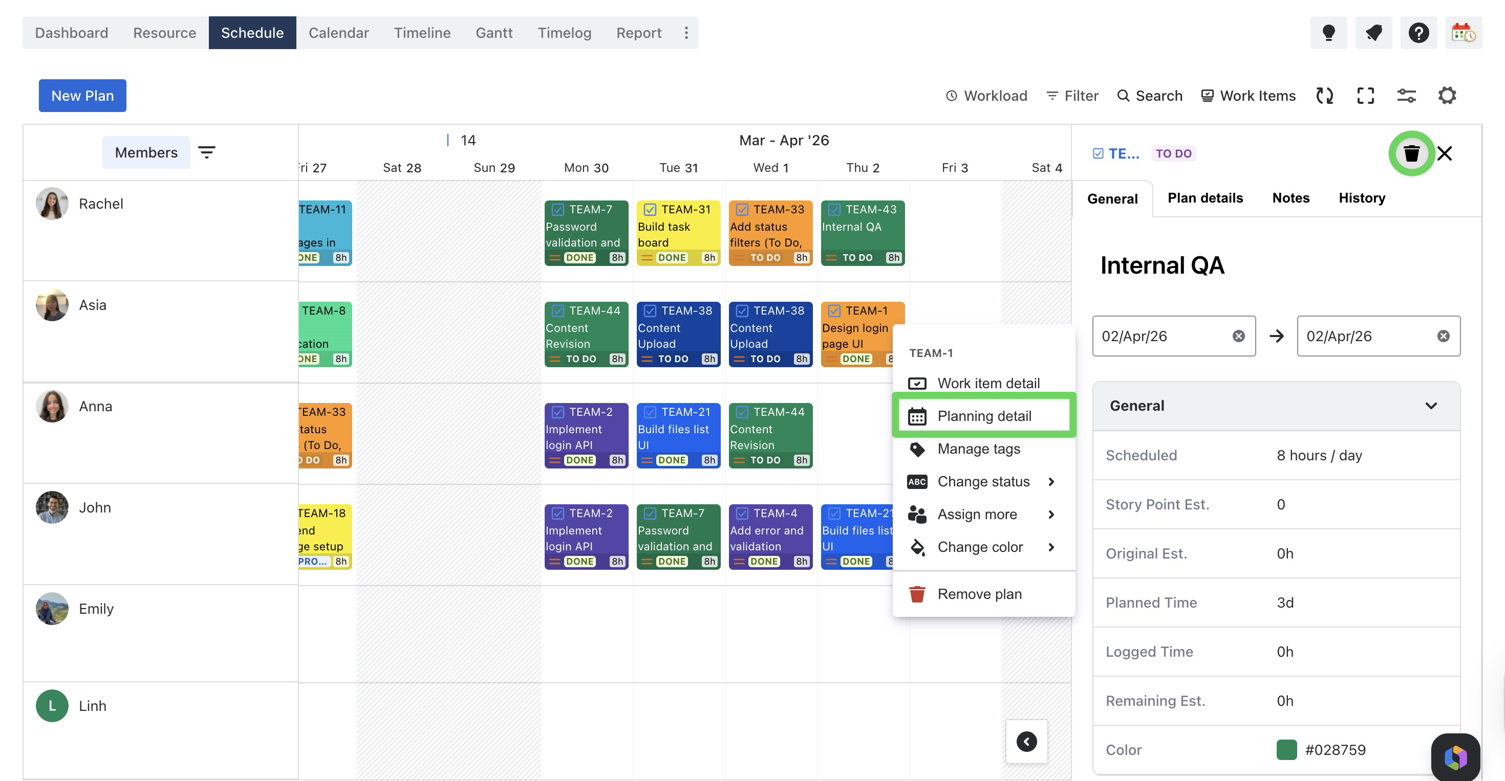 The Planning Detail Panel provides a space to display additional information about a specific task. This panel is designed to manage and update plans directly from the Schedule Board or Calendar Board.