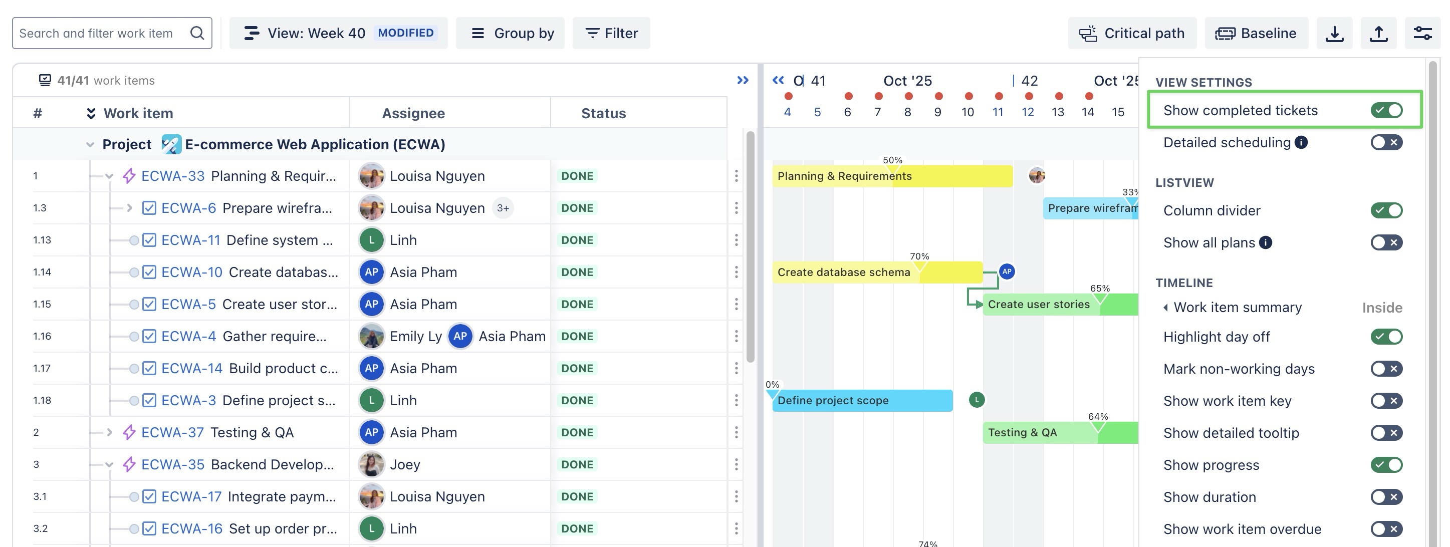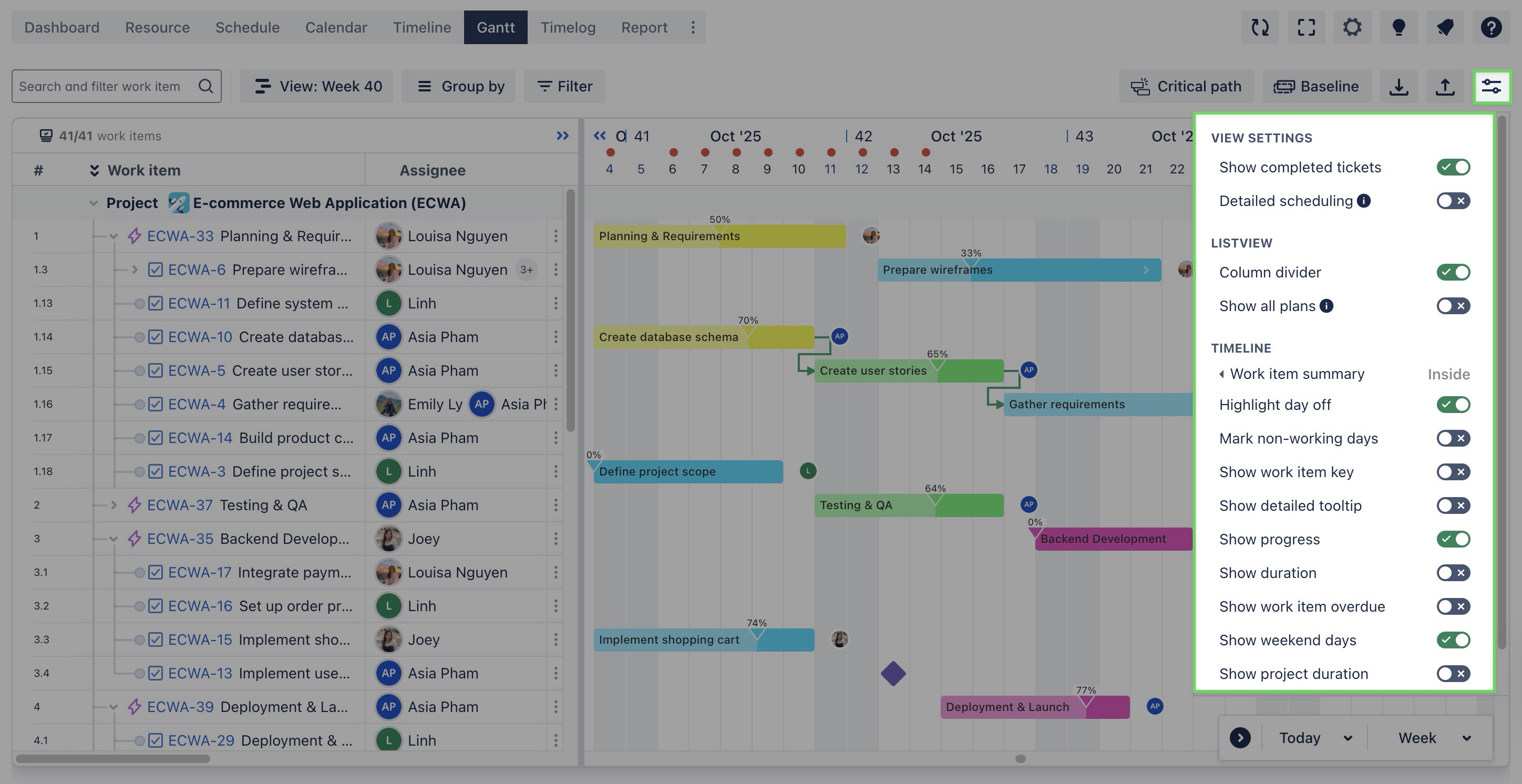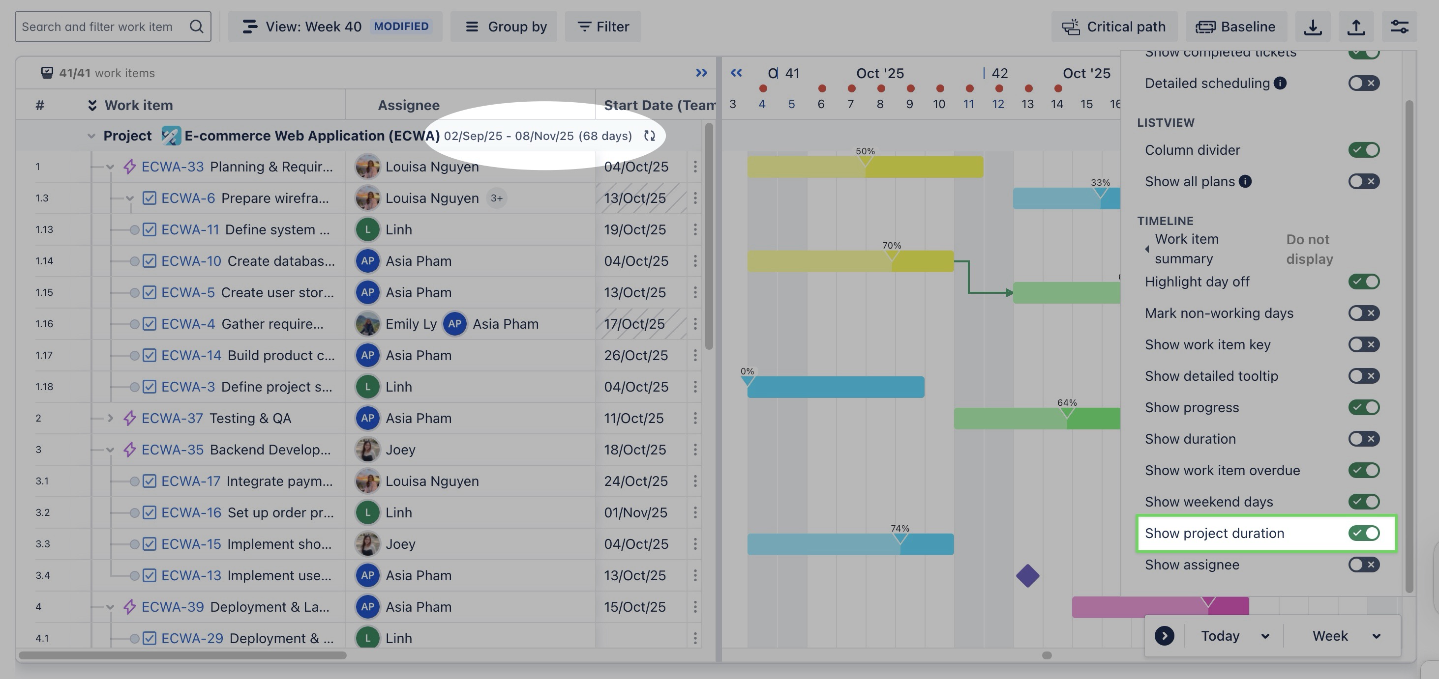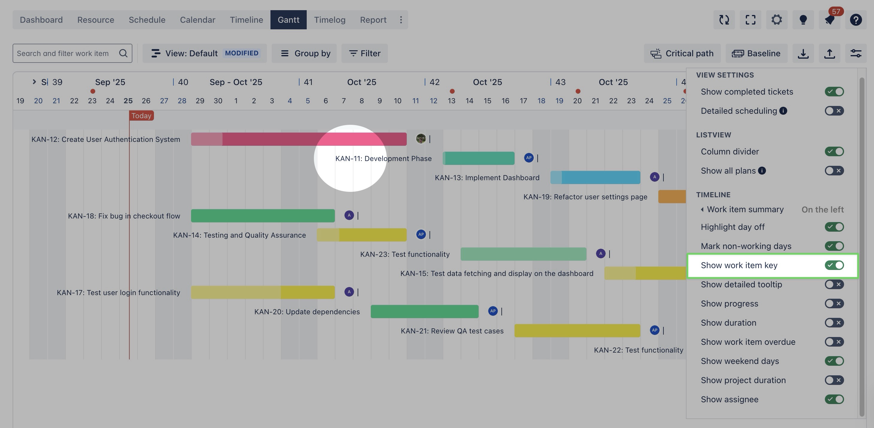 Show work item key: When enabled, the unique identifier (work item key) for each task or ticket is displayed on the timeline. | ![]() |