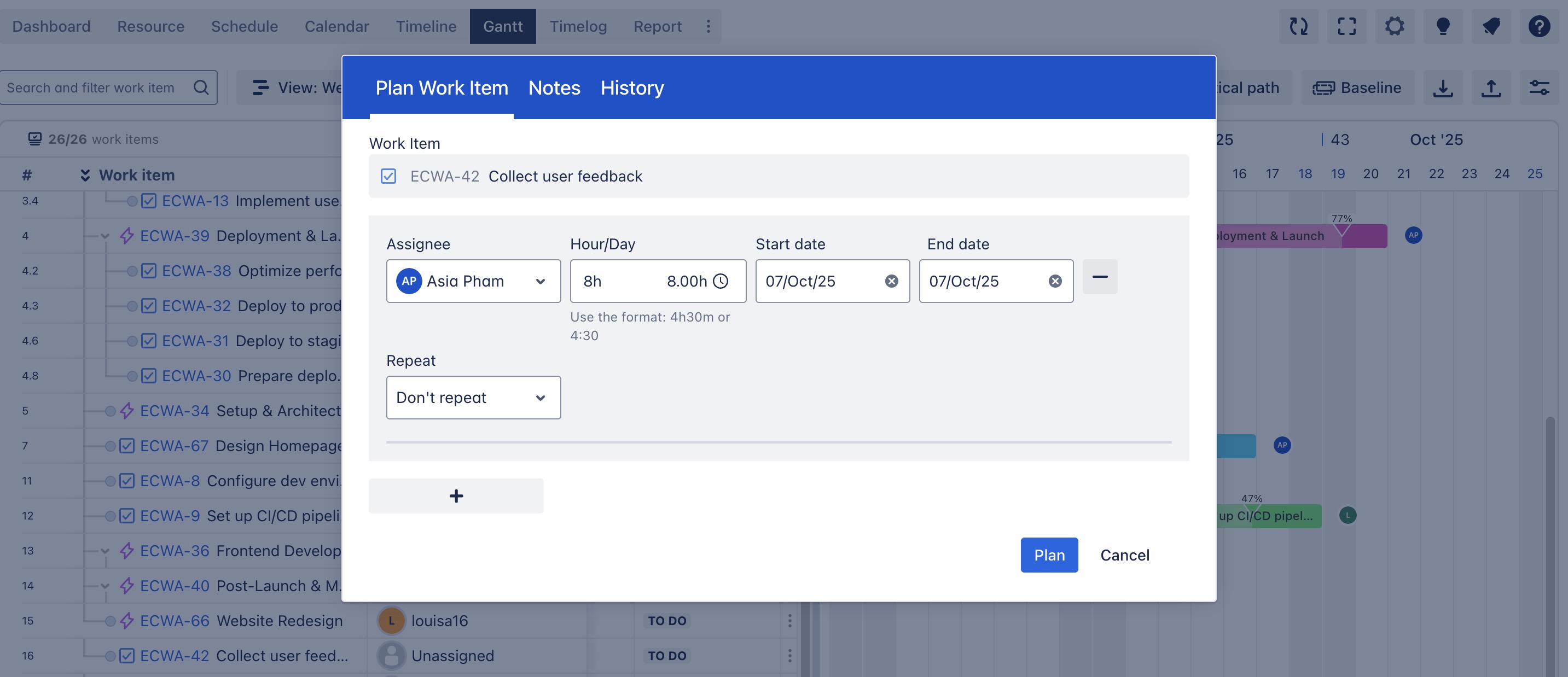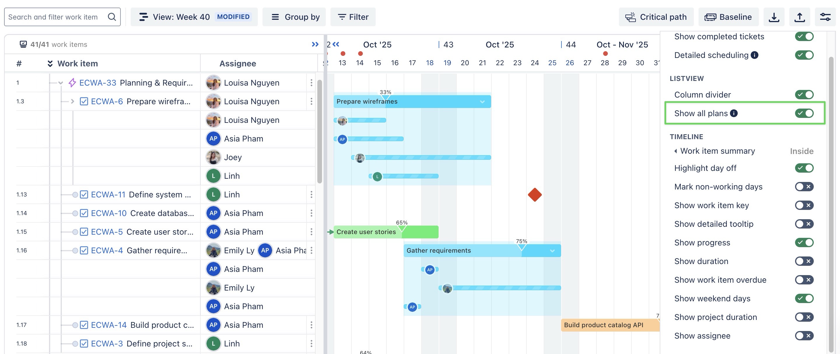 Show all plans: When enabled, every scheduled plan linked to a work item is displayed on the timeline, instead of only showing the main task bar. | ![]() |