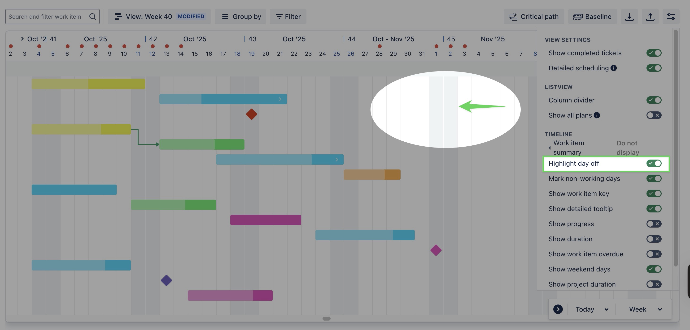Highlight day off: When enabled, days off such as weekends or holidays are highlighted in gray on the timeline. | ![]() |