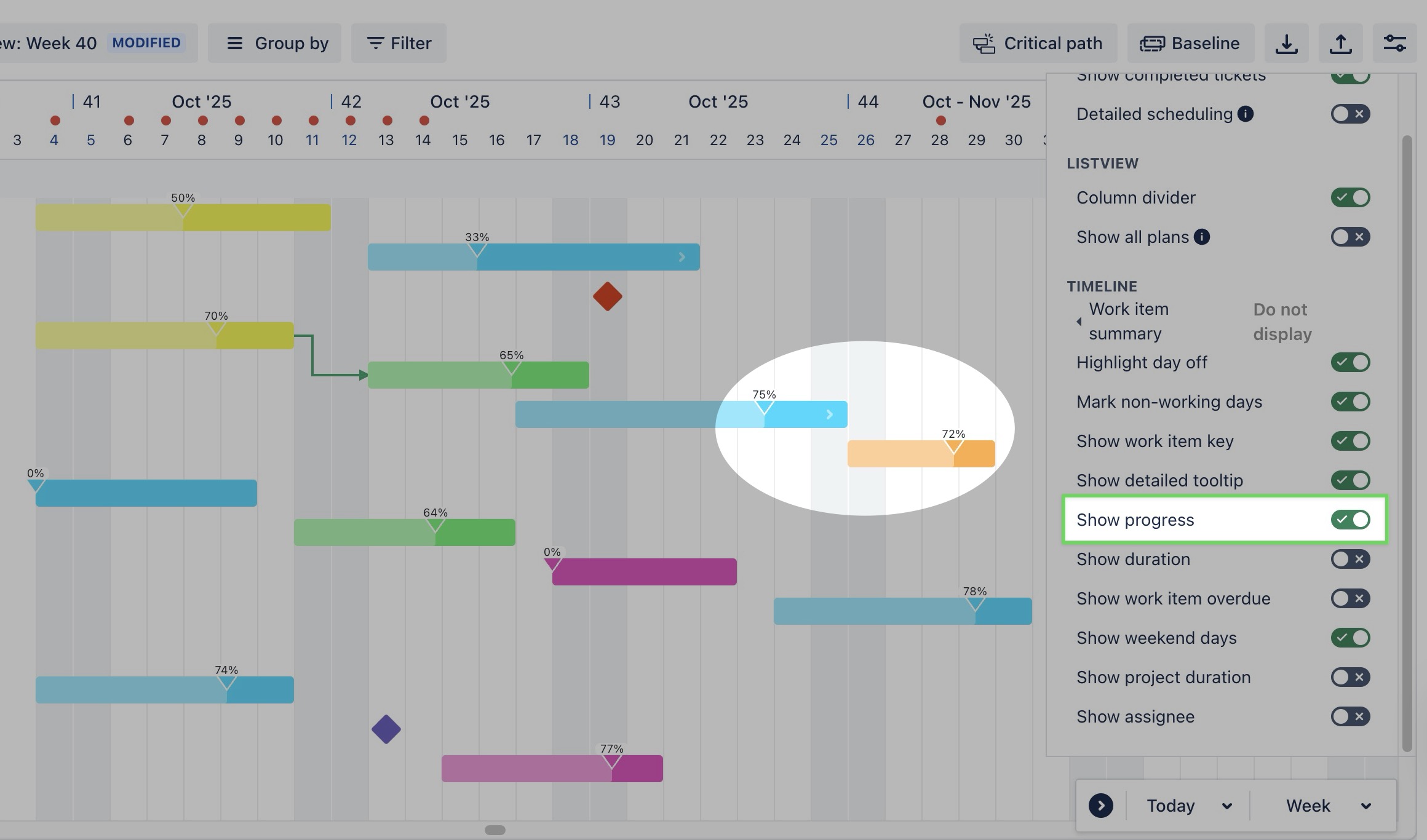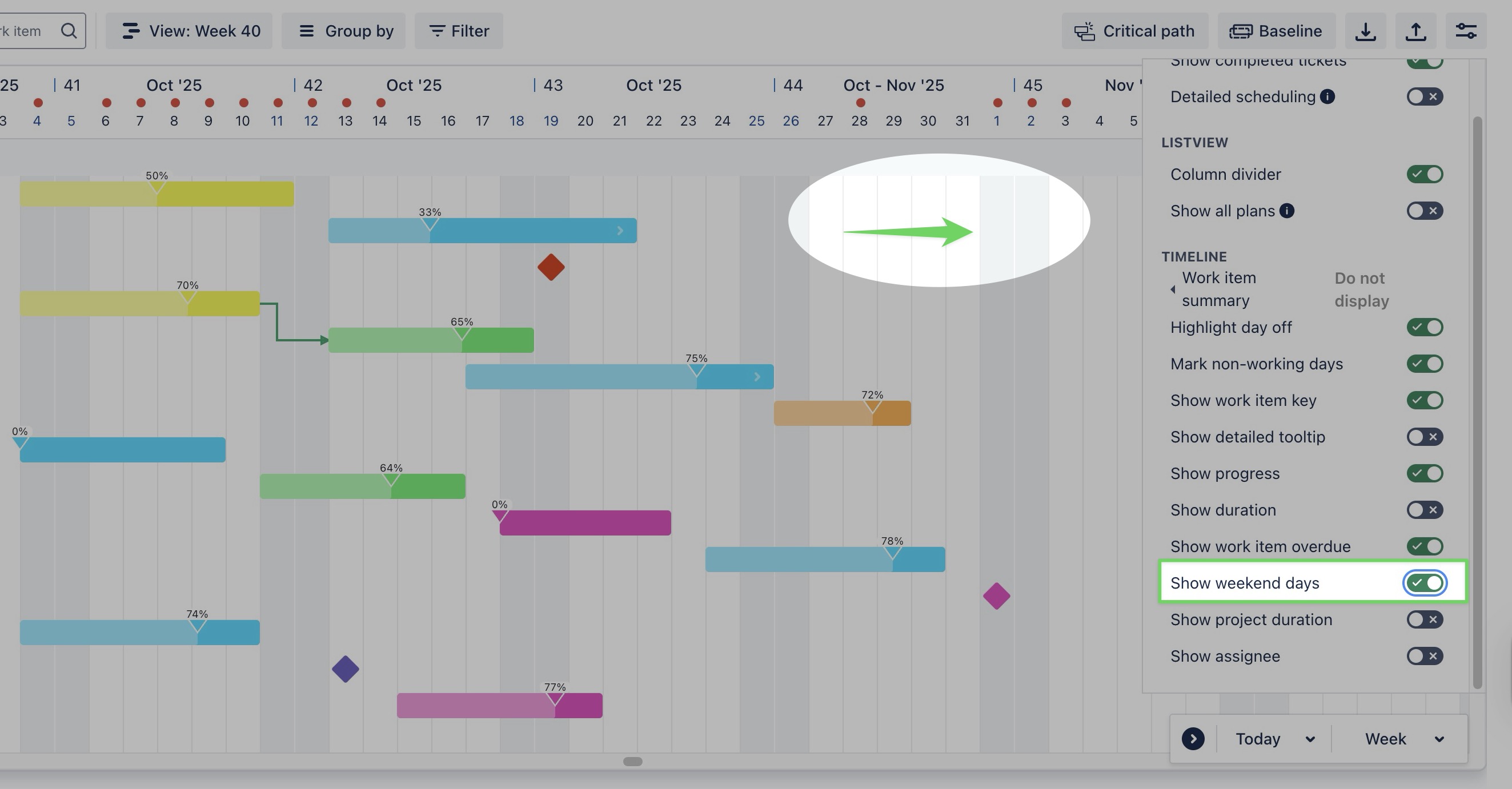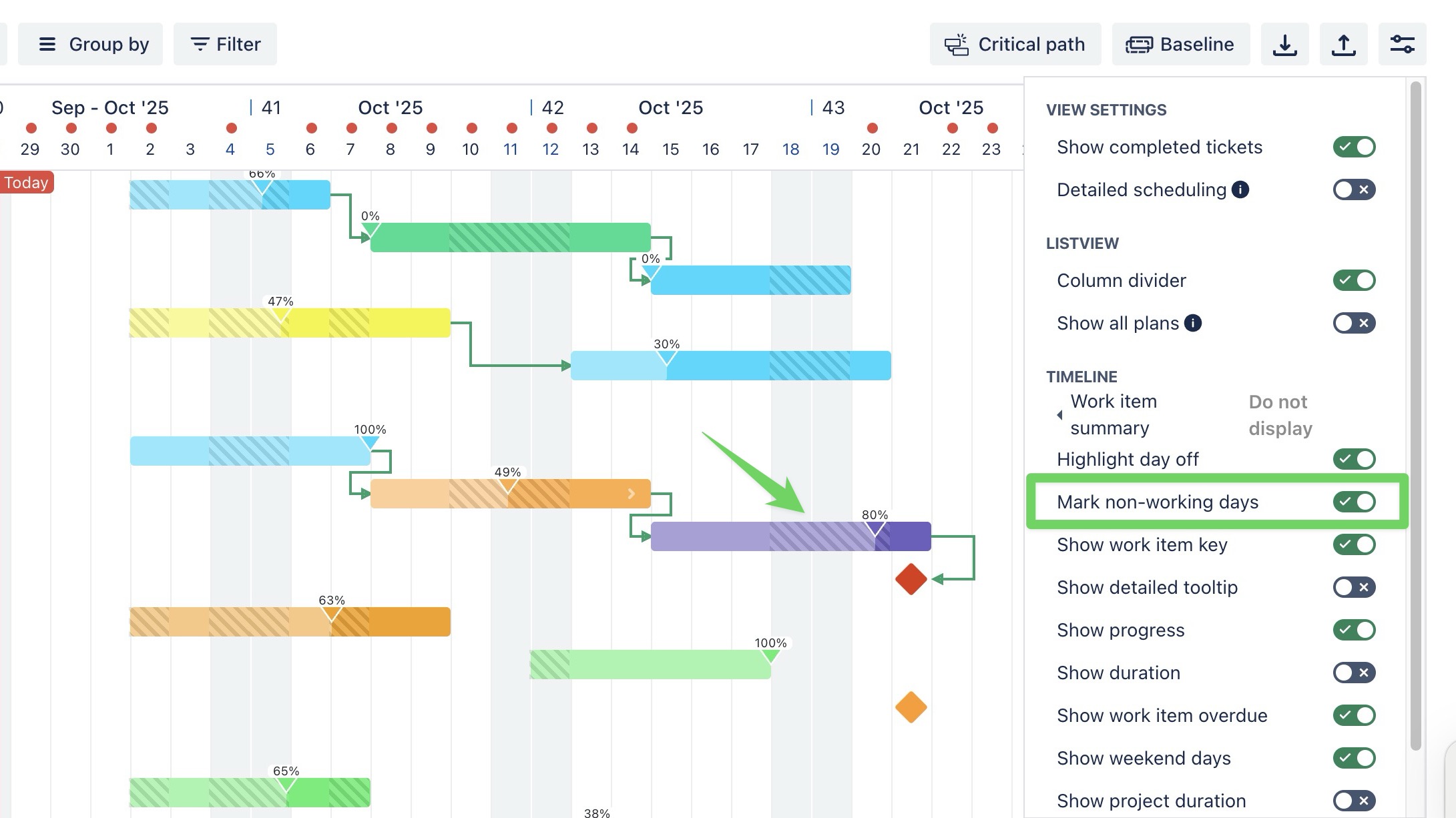 Mark non-working days: When enabled, non-working days such as weekends or holidays are marked on the Gantt bar for clarity. | ![]() |