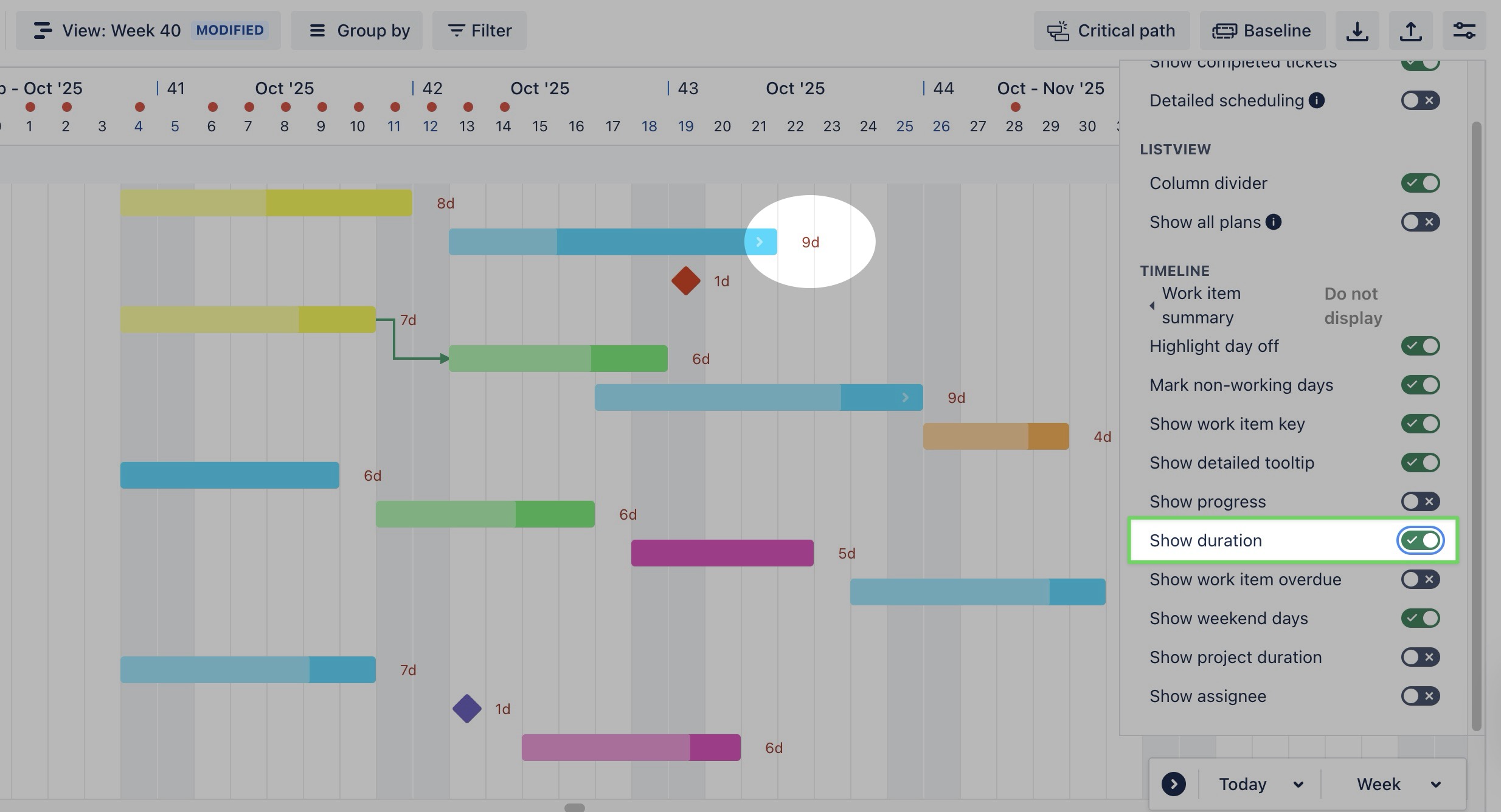 Show duration: When enabled, the total scheduled duration of each task is displayed on the timeline. | ![]() |