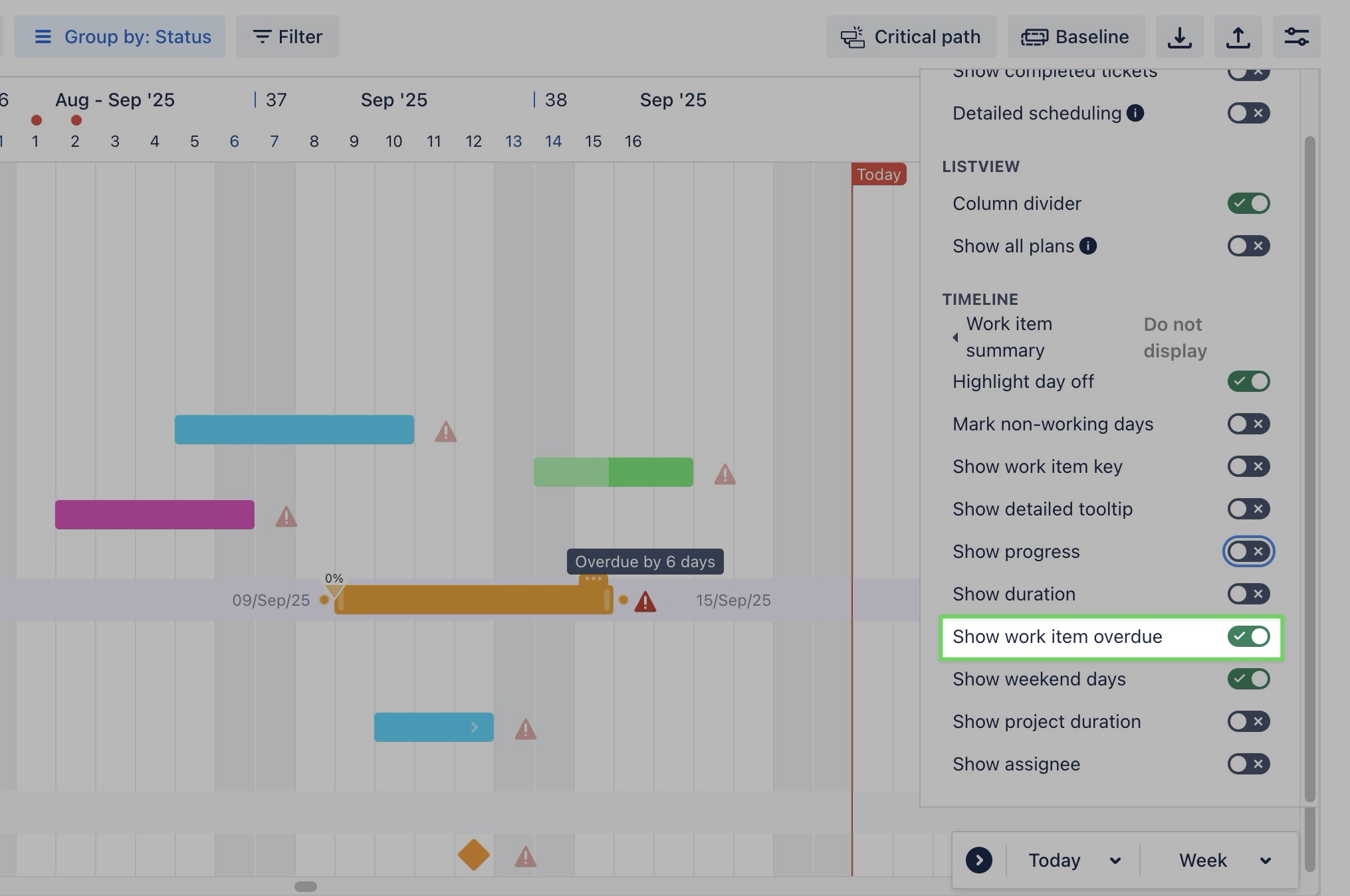 Show work item overdue: When enabled, overdue tasks are marked with | ![]() |