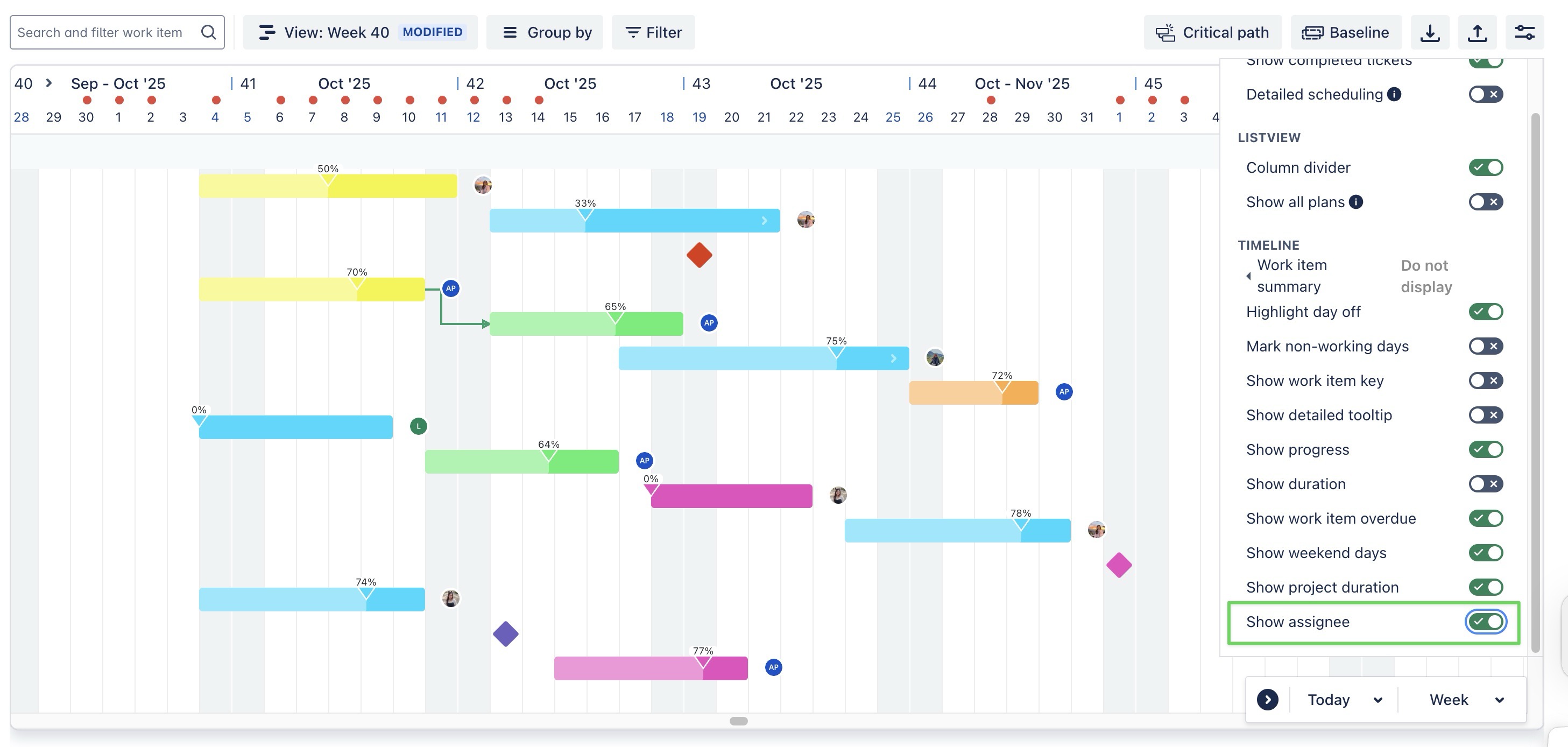 Show assignee: When enabled, the assignee is displayed next to the Gantt bar for easy identification. | ![]() |