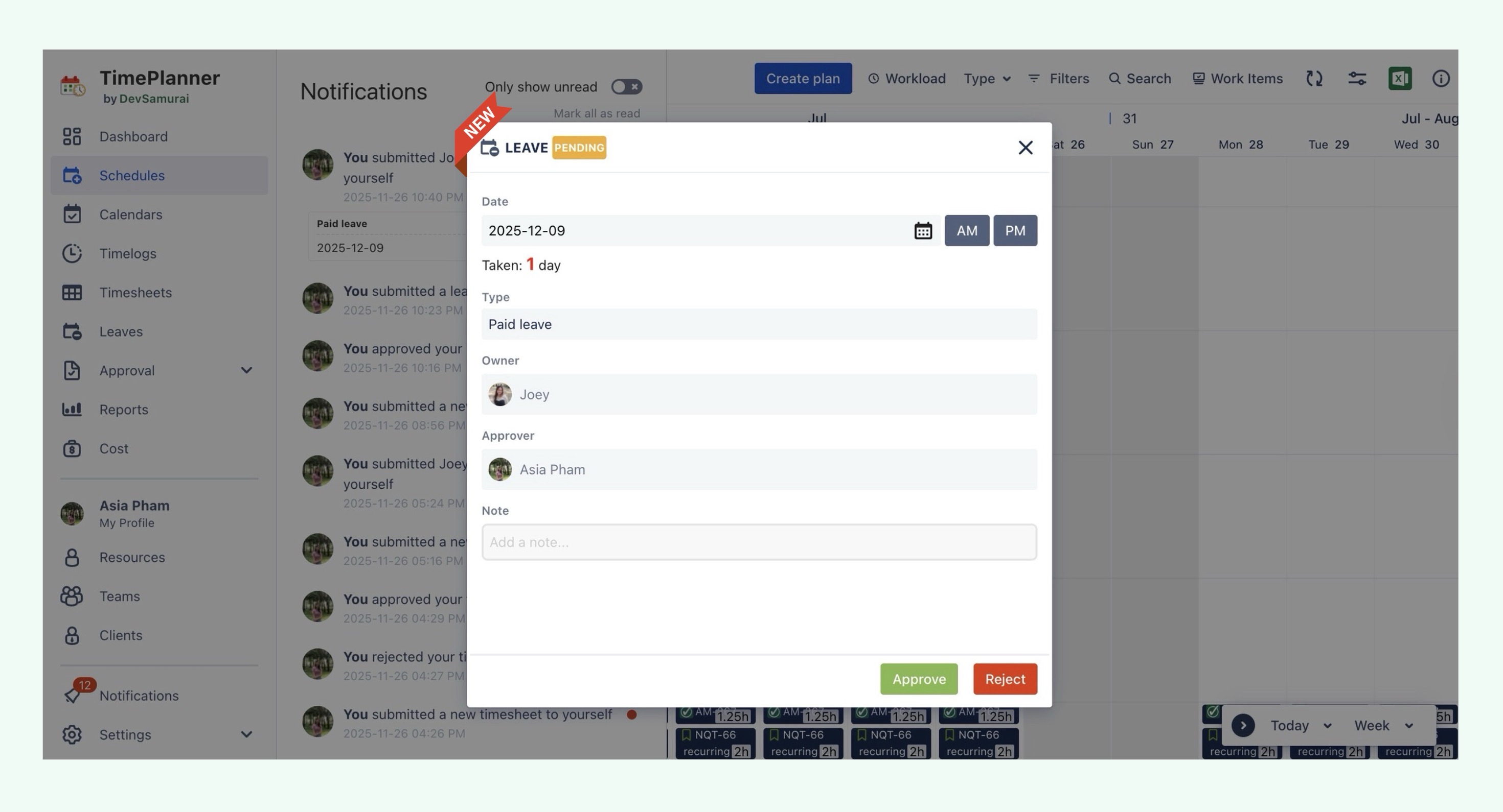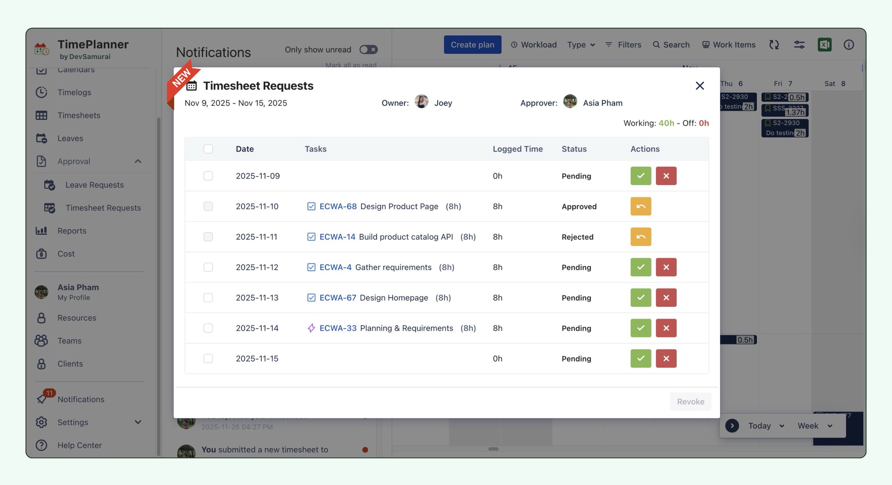 You can now open timesheet requests directly from notifications. A pop-up dialog appears instantly, allowing you to review and take action without disrupting your workflow.