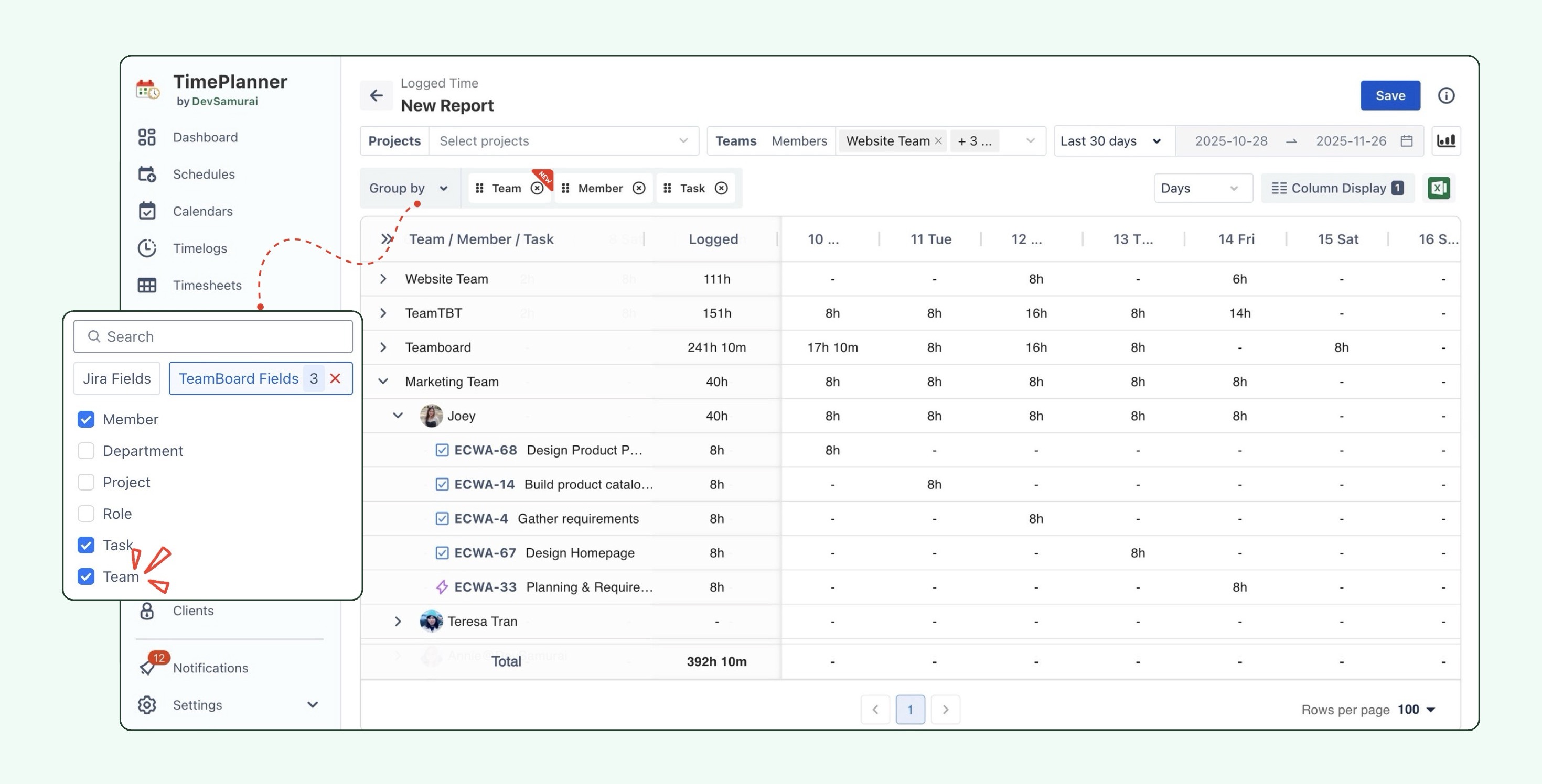You can now group data in the Hierarchy Report by Team, giving you a structured view of how work is organized and managed across different teams within your organization. This also makes it easier to compare performance and results at the team level.