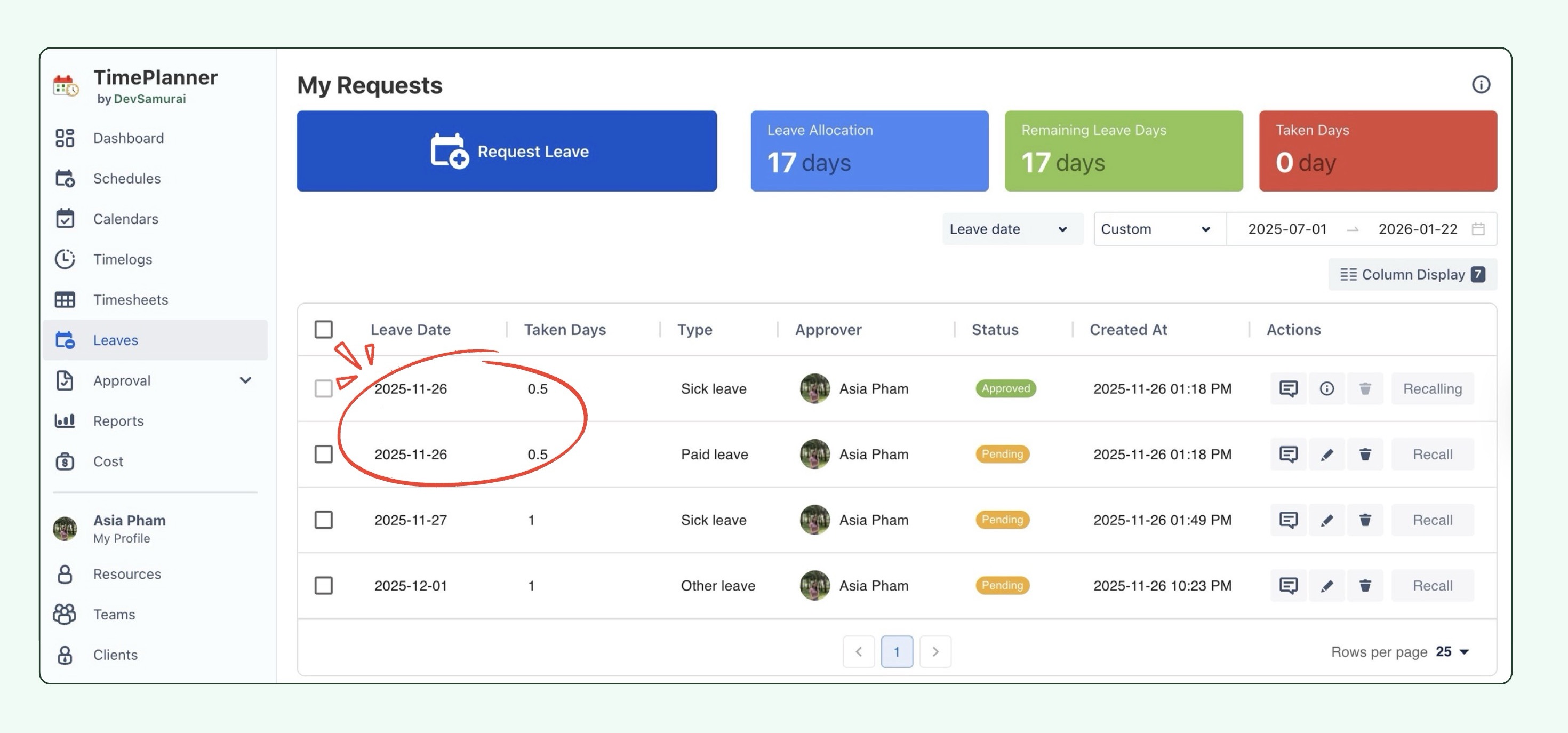 Users can now submit more than one half-day leave request for the same day, as long as the total leave does not exceed one full day.