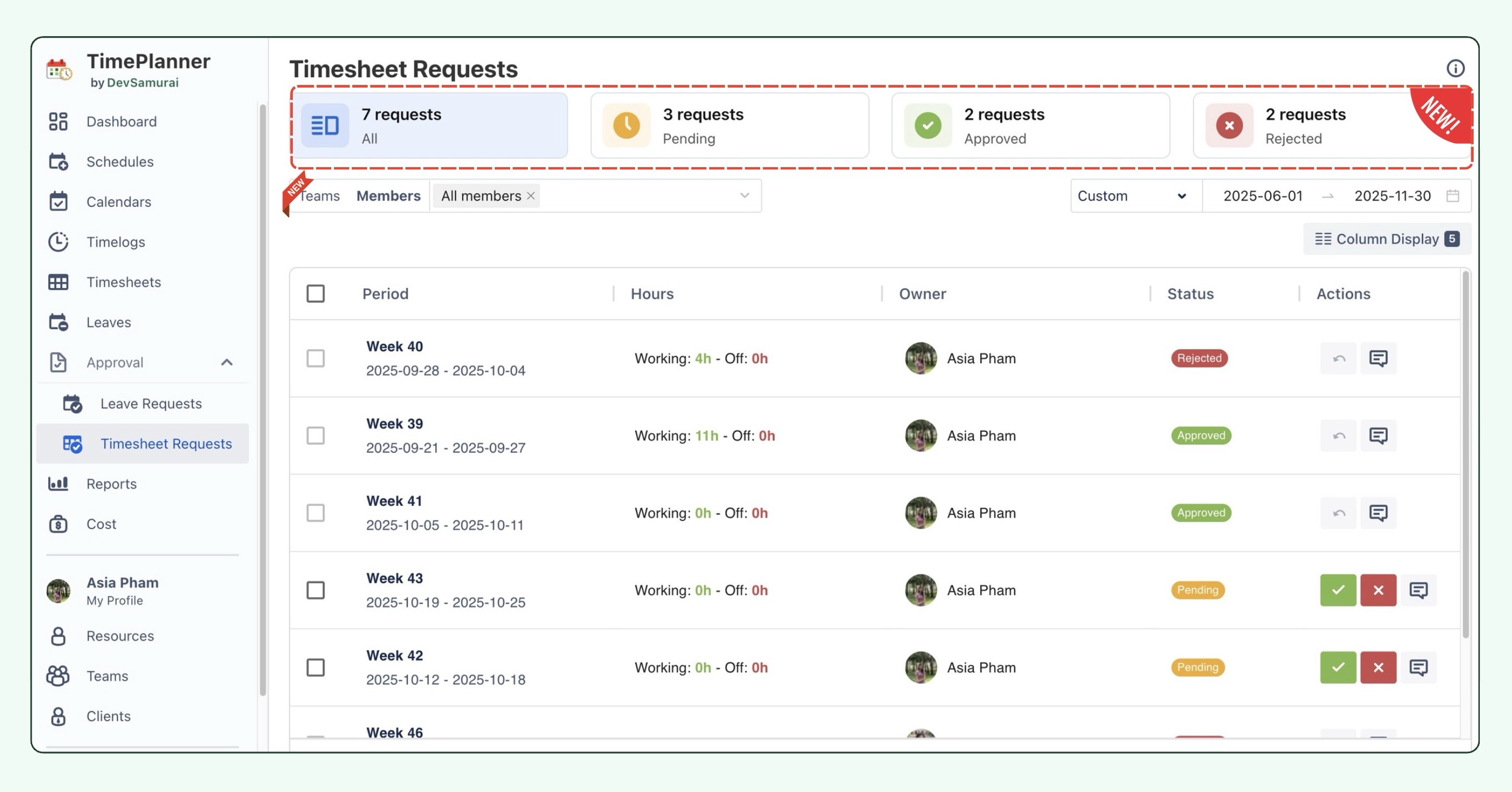 You can now filter timesheet submissions by Team or select multiple members at once, making it easier to review and manage requests across groups.